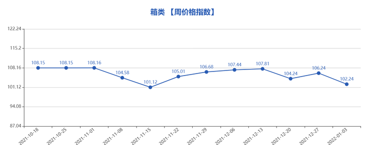 箱类本周价格指数102.24点,涨后回落。内销方面,临近年关,部分商家推出少量特价拉杆箱,深受上班族喜爱;帆布类小型拉杆箱、旅行箱销售表现不俗,主要销往国内各大商场、旅游景区;可放置随身衣物及日常用品的中高档可折叠航空箱销量上扬,采购商下单积极。外销方面,帆布材质中档拉杆箱因小巧、轻便的特点,受到采购商青睐,主要销往欧美国家;功能齐全、便于携带的中高档公文箱销量可观,以老客返单为主。