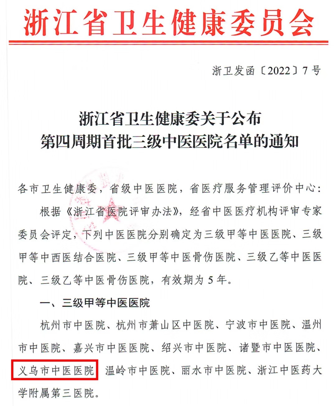 1月10日,省卫健委公布第四周期,首批三级中医医院名单,义乌中医医院正式被确定为三甲,成为此次浙中地区唯一的三甲中医医院