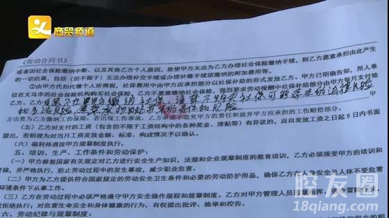 工厂负责人 蒋成强:当事人说自己在老家买了新农保,不愿意在义乌购买。这里你看都有写的,自愿不在甲方这边购买社保,清楚不购买社保可能存在的法律风险和生活风险,愿意承担因此带来的责任和风险。