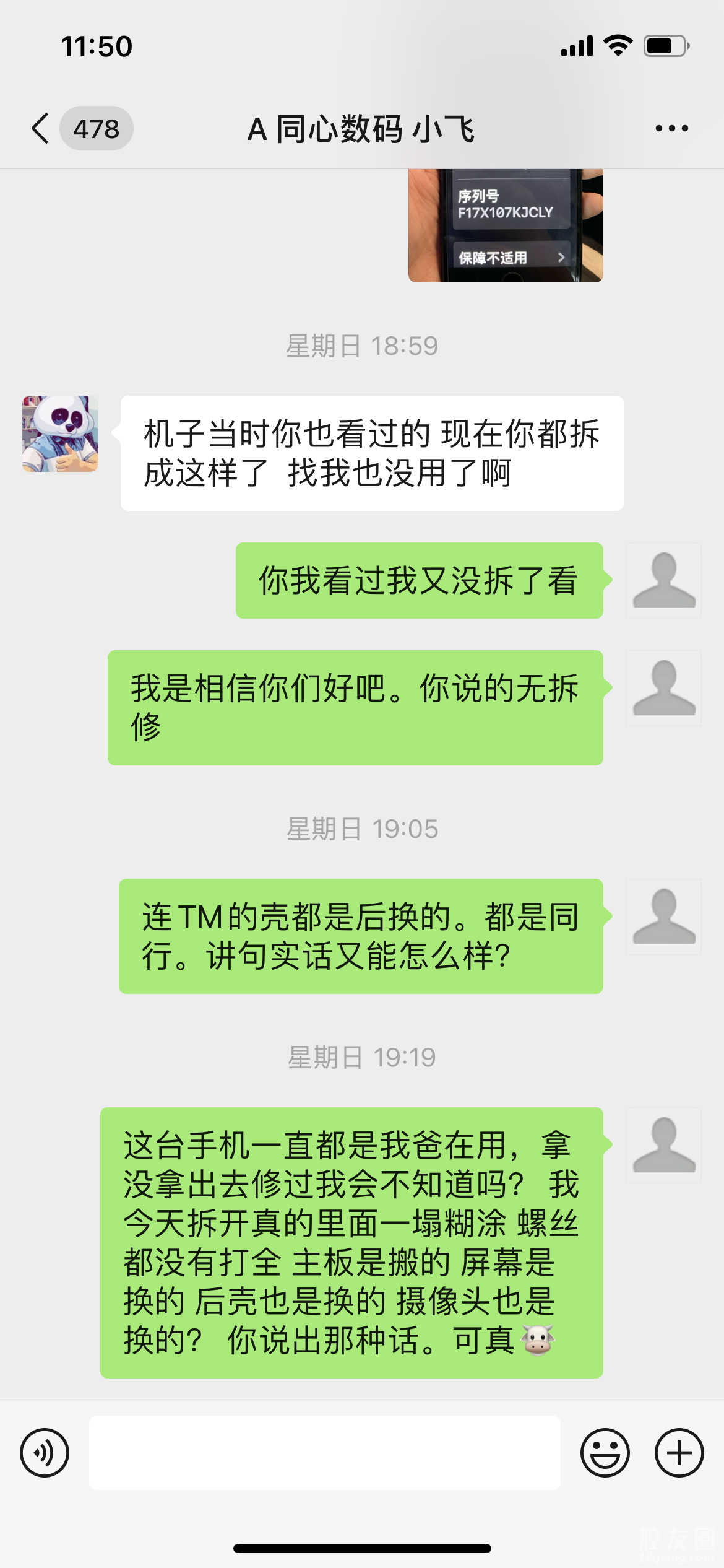 主板是搬板拼凑的,屏幕是副产的,后壳是副产的,连摄像头都不是原厂序列,于是我第二次问店家,店家居然说你已经拆了,鬼知道是不是你自己去维修的,你们生意都是这样做的吗?满嘴谎话,欺骗消费者,还死不认账,说好的无拆无修呢?