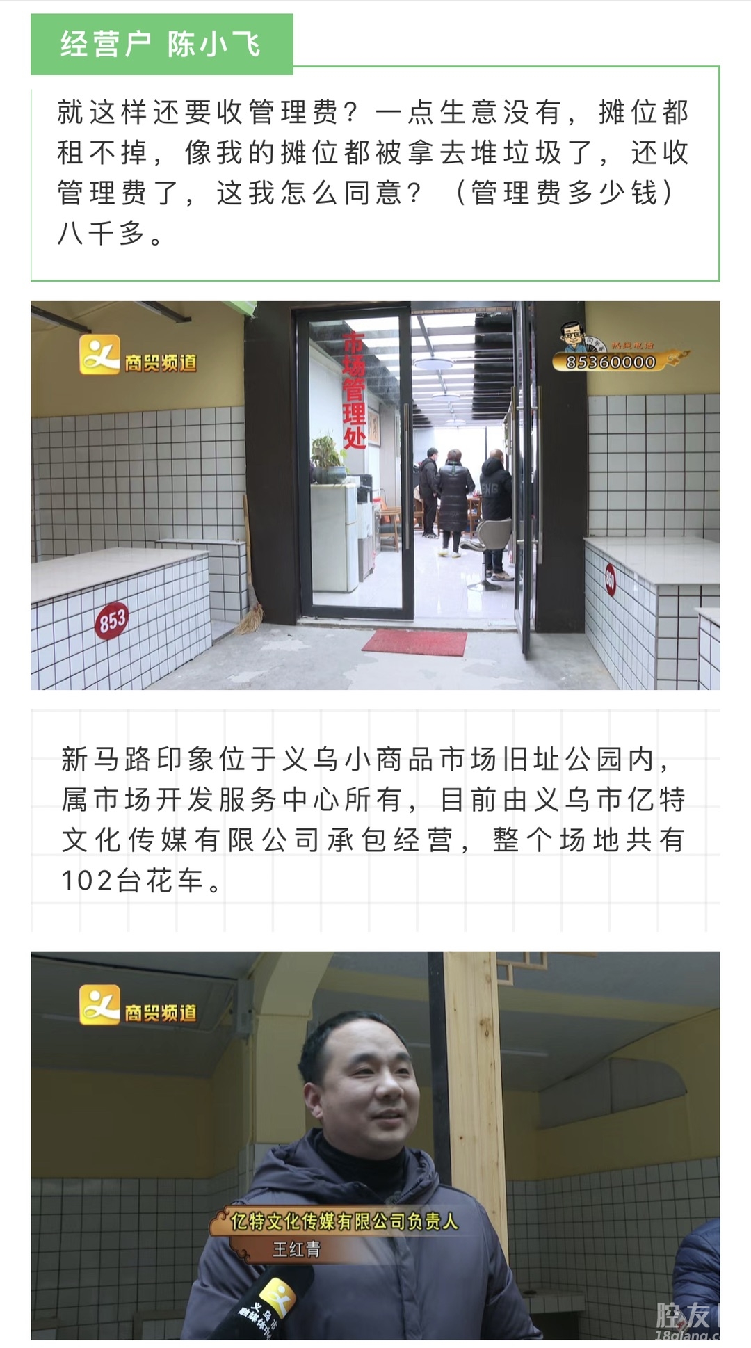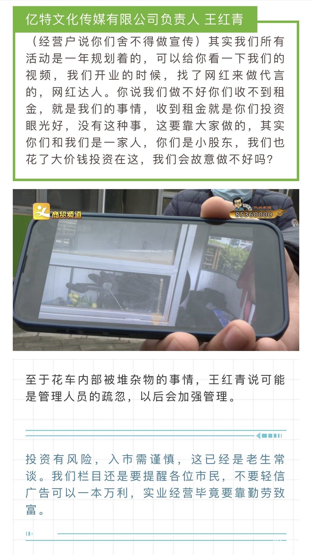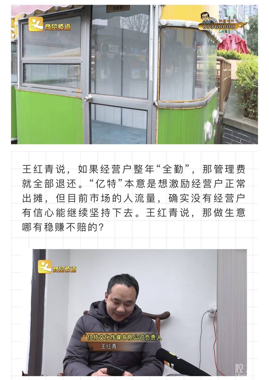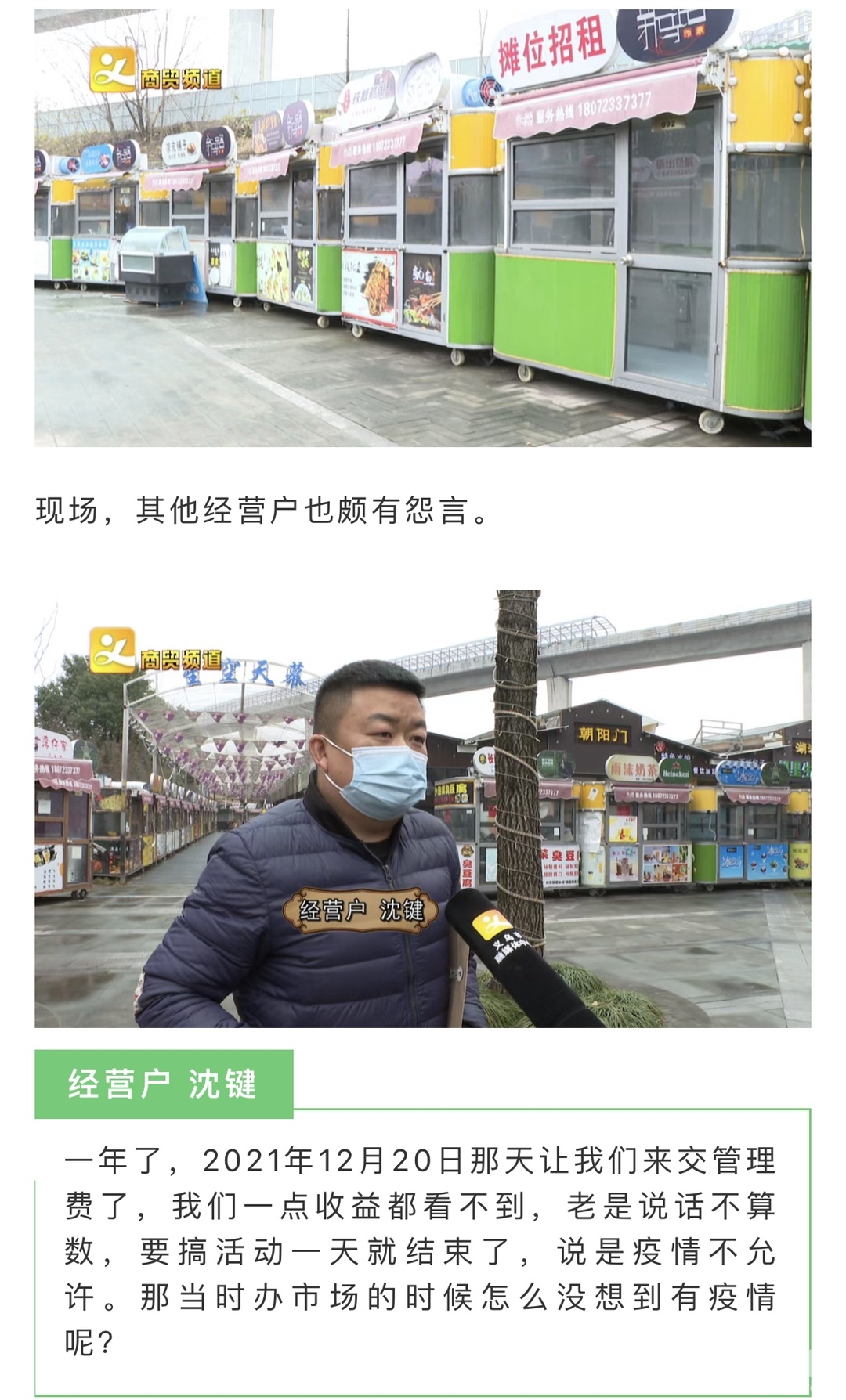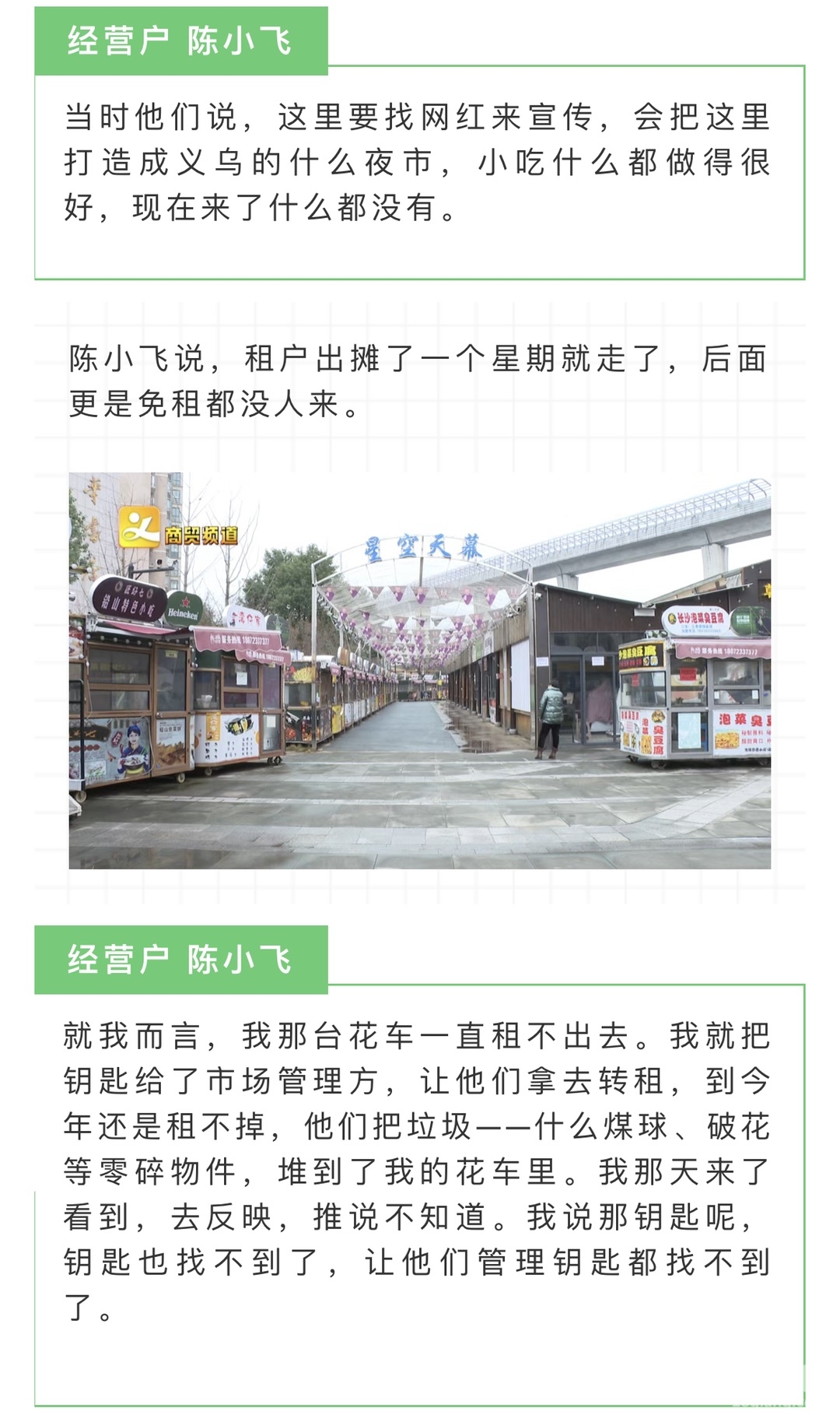 市民陈小飞向我们栏目反映,他之前在新马路夜市投资了一个花车摊位,结果开业一年了都没有租出去,生意十分惨淡。而他前段时间还发现,花车内部已经被人用来堆杂物了。陈小飞说,就这样市场管理方还打算收下一年的管理费,合适吗?