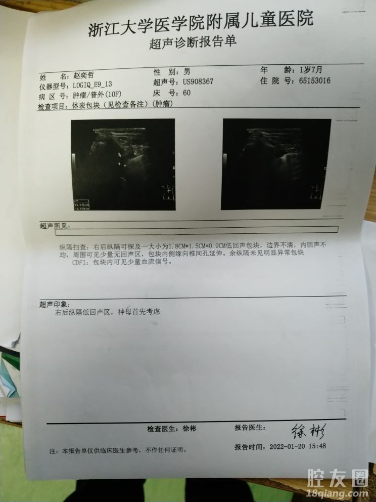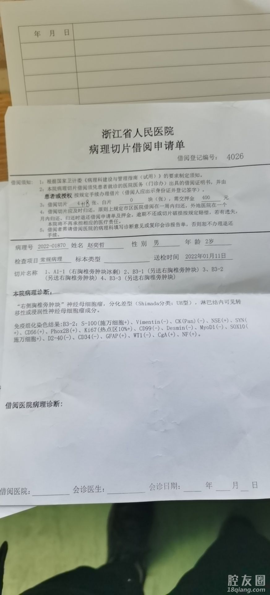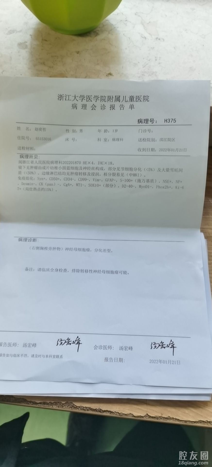 2021年12月份的时候,儿子在走路的时候老是摔倒,总是磕磕碰碰,我们一开始以为是崴到脚了,直到发现不对劲的时候,我们就近到佛堂镇医院就诊,医生让我们去义乌市医院,做了脑部磁共振,觉得是小脑炎,医生建议转到杭州市儿童医院做进一步检查, CT 检查初步诊断是纵隔肿瘤,马上给我们安排了肿瘤切除,术后切片病理分析报告显示:【神经母细胞瘤】