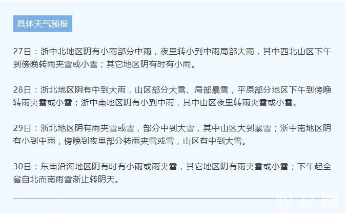 雨水连绵,气温低迷,这是南方常见的湿冷魔法攻击。接下去,湿冷感会更加明显,寒意更加透彻心扉。因为今冬浙江首场大范围雨雪天气就要到了。 浙江省气象台据目前最新资料分析,预计1月31日前,我省仍持续降水天气。其中1月28-1月30日,除东南沿海地区外,浙江将自北而南,转雨夹雪或雪。浙中北部分地区,有中到大雪,山区大雪暴雪。