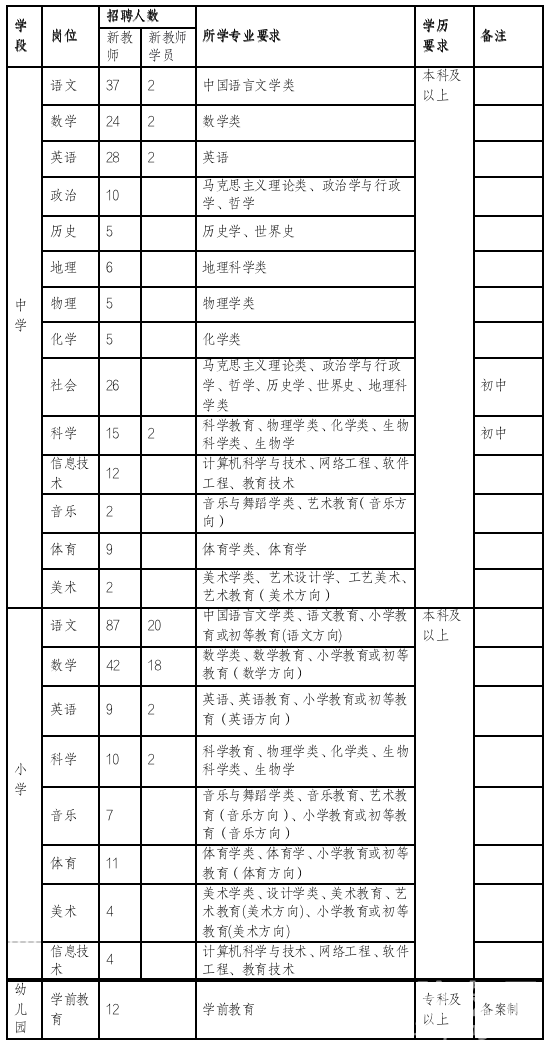 为满足我市中小学及幼儿园师资需求,2022年我市将招聘中小学新教师360名,新教师学员50名,幼儿园备案制教师12名。具体数量如下表: