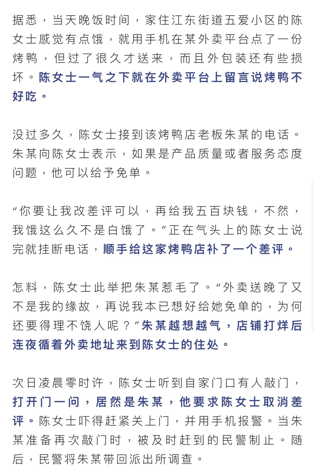 义乌一女子给外卖打差评!凌晨,商家敲响了她家的门...