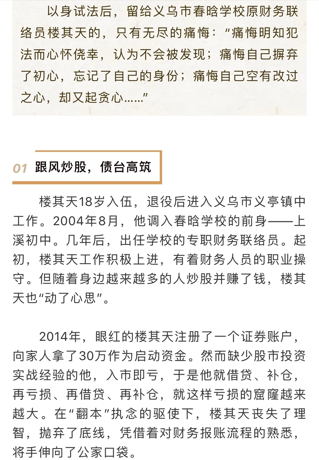 [义乌故事]160多万!义乌某学校财务挪用公款去炒股,后悔也来不及了! [复制链接]