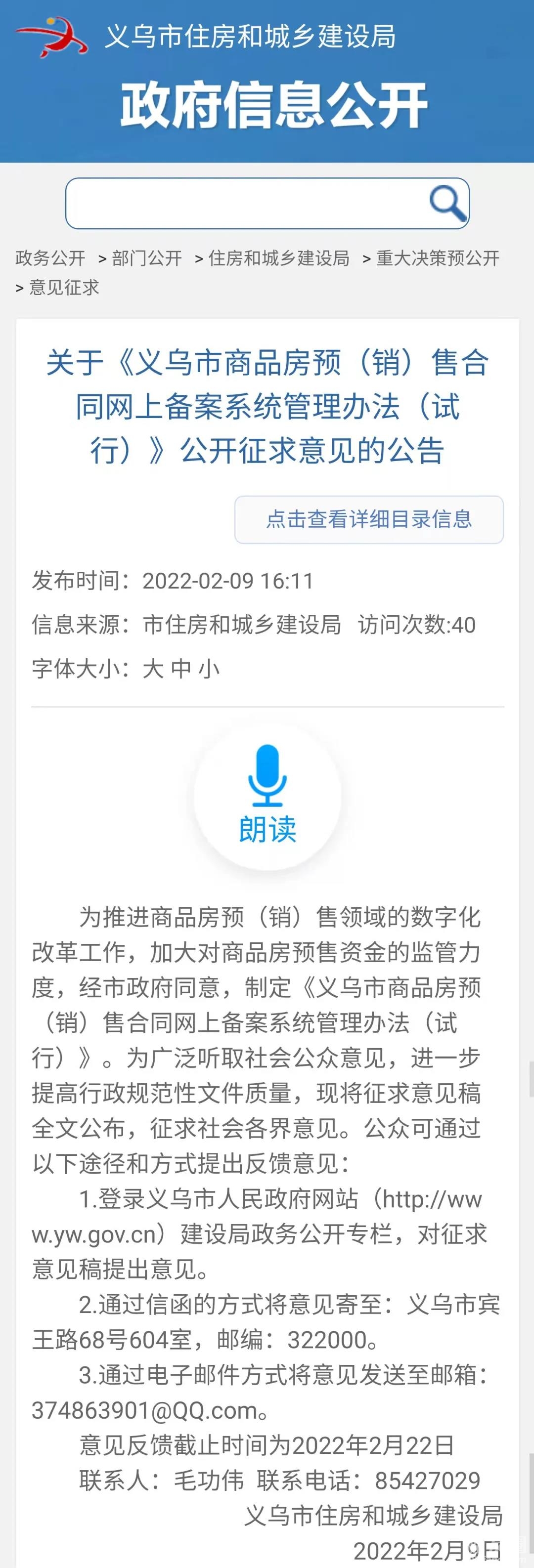 今天,记者从义乌市建设局了解到,为规范商品房预(销)售行为,提高商品房预(销)售的透明度,近日该局发布征求意见稿,拟对商品房预(销)售合同网上备案系统管理办法进行修订。