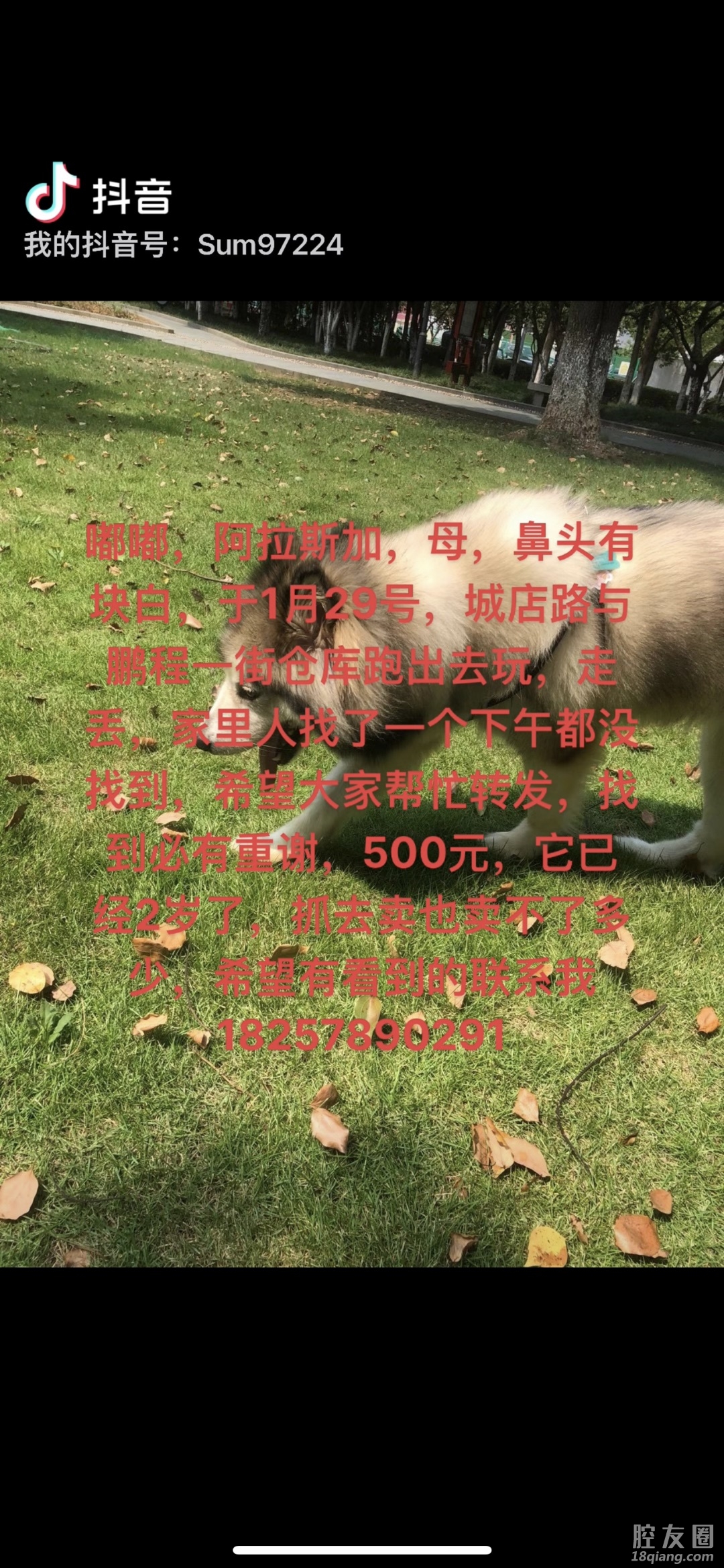 阿拉斯加,母,灰桃,有看到的朋友麻烦一定要联系我,这么久了希望它是被好心人带回家养了,如果把它带回家了麻烦联系我我接它回家,找到必有重谢