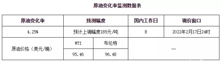根据卓创资讯数据,截至本周期第八个工作日,原油变化率为4.25%,目前预计上调油价185元/吨,折合升计算为上涨油价0.14元/升-0.16元/升,本周四晚间成品油调价窗口将打开。