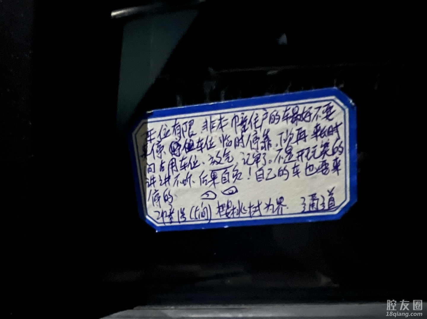 不知道贴小纸条的房东能不能刷到这条帖,首先肯定是要先说声抱歉,的确是因为有急事才临时决定要离开义乌,至于多急呢,您从后排车顶没来得及关的顶灯也能看得出来,我的确是非常着急走,的确是没有想占用太长时间,其次,我停车的时候也是观察过地上有无地锁,(一般认为有地锁的都是私家车位,不会去停)然后我停的时候边上车位也是比较多的,可能因为是白天比较空,所以也就没多想,看到空就停下来了。因为我停的时候右侧有一辆车左侧是空的,所以我停中间车位的时候怕右侧车辆开门不方便,所以往左边停了一点,左边车位也并未被挡住,没有影响正常通行,还有就是我也是第一次停童店这个小区,所以也不清楚你们的停车位情况,还有您也不用说:下次再来放气,不是开玩笑,讲讲不听后果自负等话,因为完全不可能有下次,如您这里是私家车位,您可凭车位产权证与本人进行沟通协商,我也会补停车费给您,或者是停车期间您觉得有什么不妥也可以给我来电(车上有留联系方式),但是我在停车期间并未收到您的短信或电话提醒,我也是看到了您留的不干胶小贴纸才发现原来您的困扰这么大,再次说声抱歉。