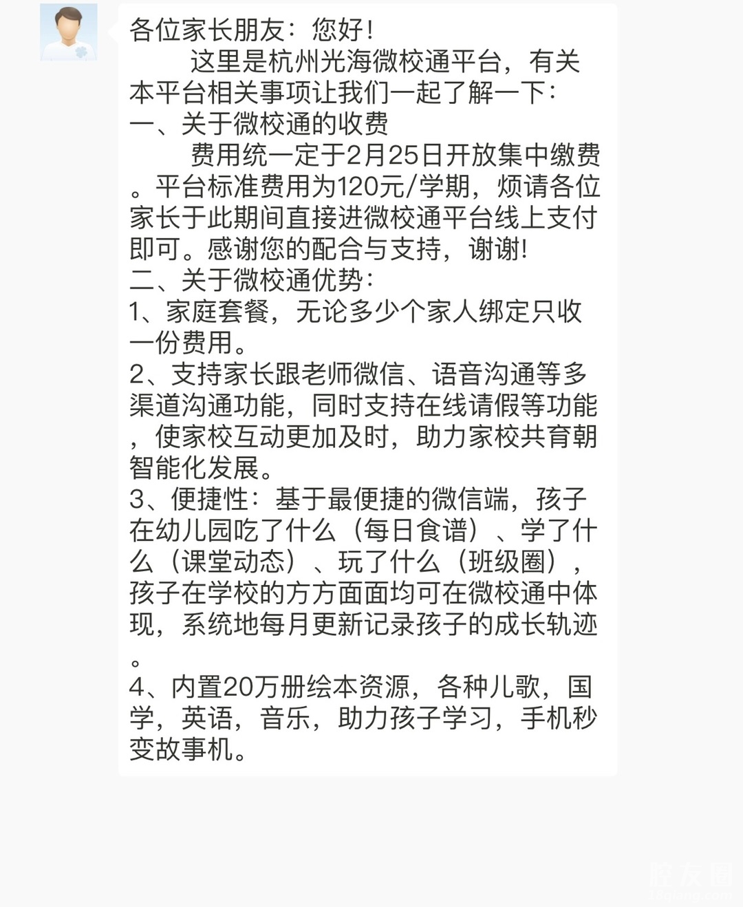 要知道孩子吃了什么,在学校活动是什么,必须关注公众号一个学期120元,首先不是差点这点钱,只是觉得这个费用有点荒谬,连自己孩子在幼儿园吃什么,一天到晚做了什么知情的权利都要交钱才能知道。而且学校也没摄像头上星期提了到现在还没装。