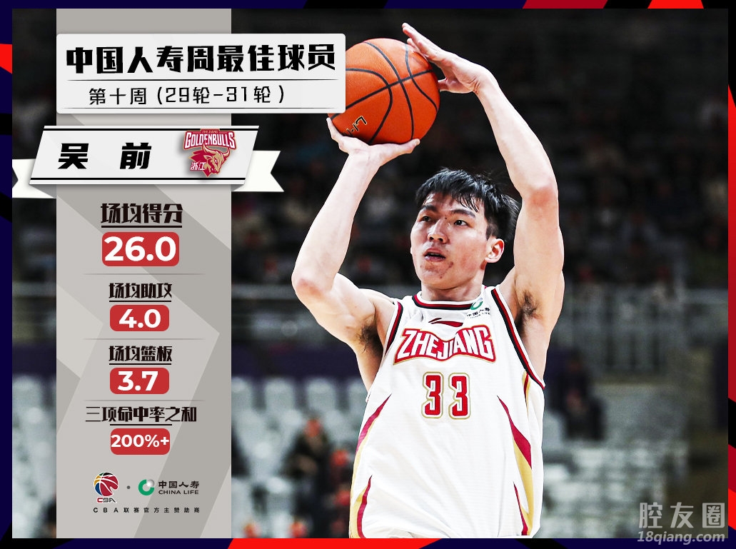 【2021-2022赛季CBA联赛中国人寿周最佳球员第十周人选出炉】国内球员吴前和国际球员琼斯当选周最佳球员。