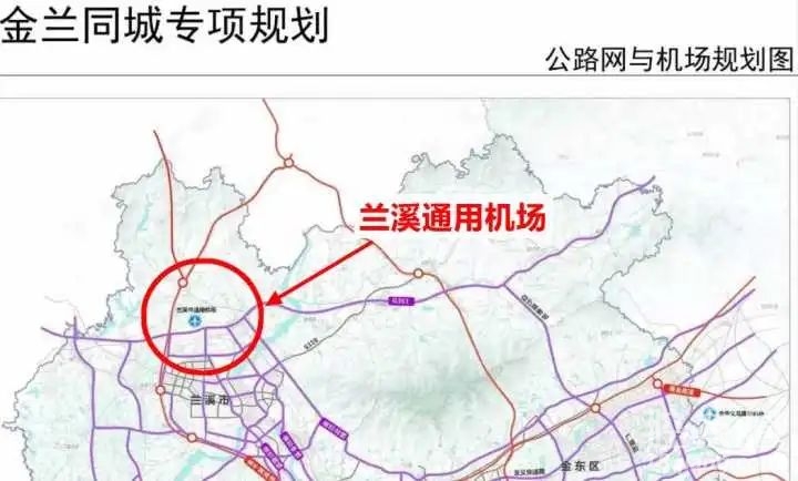2021年11月29日,金兰同城专项规划(草案)公告发布,其中公路网与机场规划图中,标注有兰溪通用机场大致规划位置