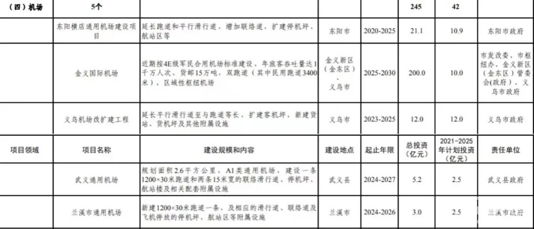 3月3日,《金华市人民政府办公室关于印发<金华市重大建设项目“十四五”规划>的通知》发布。“十四五”期间,金华将新建金义国际机场(义乌机场迁建)、实施义乌机场提升改造。完善通用航空网络,完成横店通用机场改扩建工程,新建兰溪、武义通用机场,加快永康通用机场前期,努力打造全省通用航空产业示范区。安排重大建设项目5个,“十四五”计划投资42亿元。