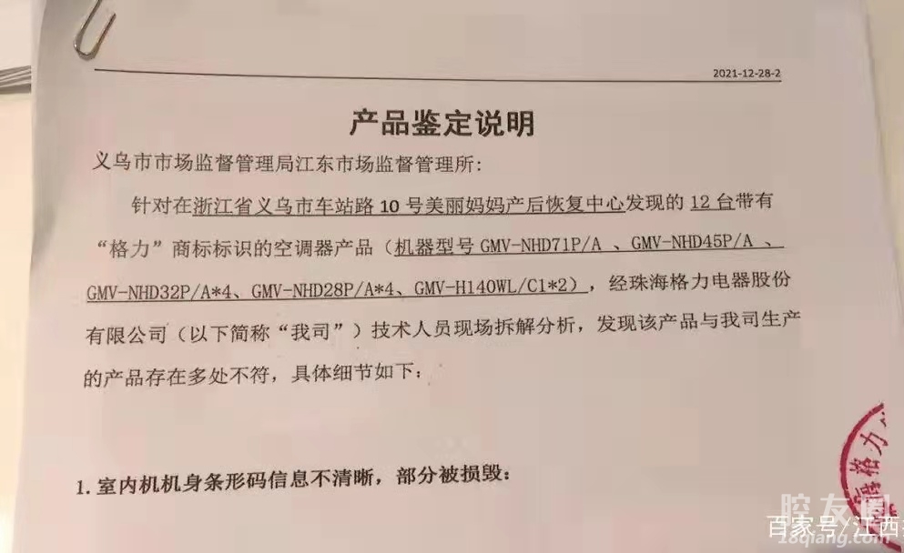 2021年12月15日,江东市场监督管理所委托珠海格力电器有限公司进行鉴定。