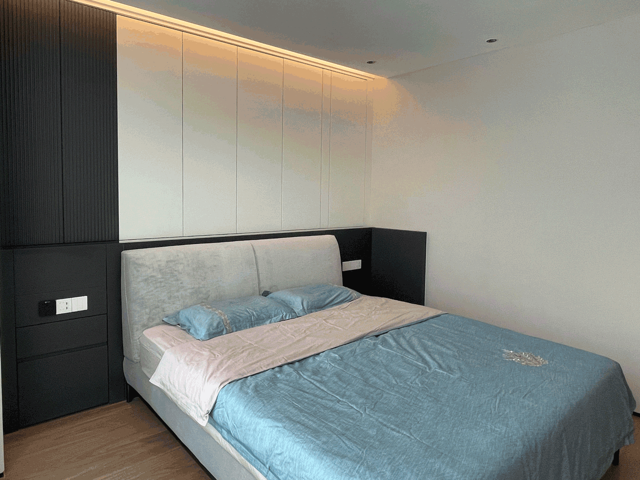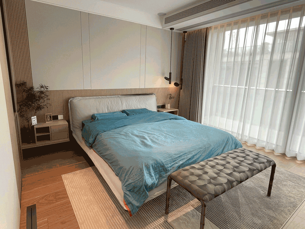 ▲主卧木饰面背景使整体空间呈现返璞归真的高级美,搭配落地窗大阳台,光线充足且通风,全屋都配置有新风系统,空气质量得到改善。