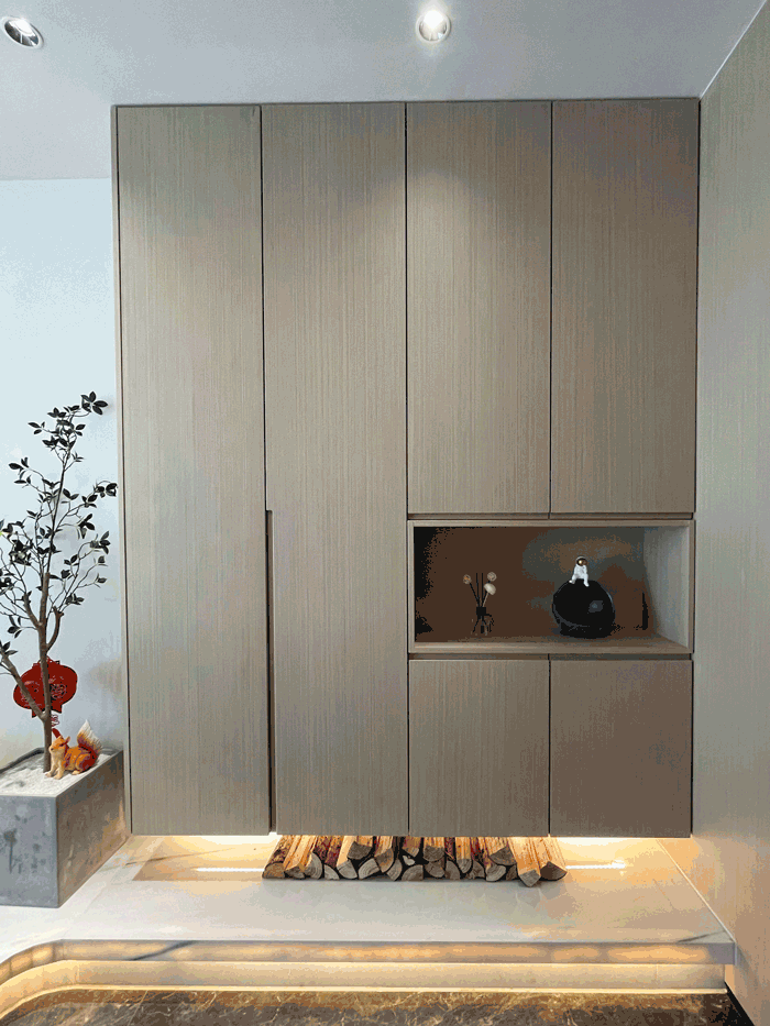 入户玄关底部内嵌层板灯,澜图实木板柜体+科技木银梨柜门,底部配上大理石玉石,自然极简风温暖而优雅,运用各种自然肌理材质,创造和谐统一的永恒的空间感。