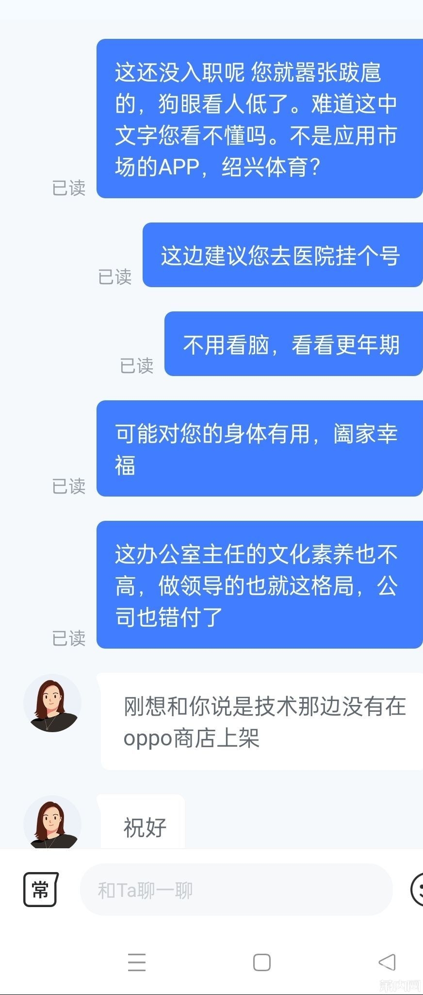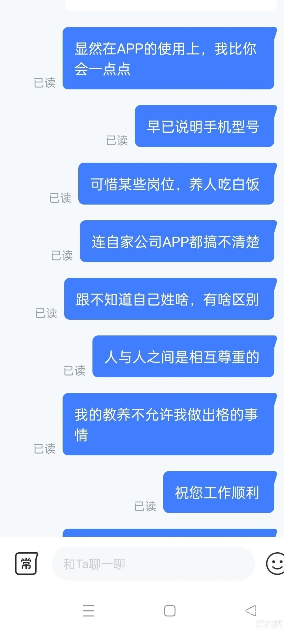 事情经过:我在智某招聘APP上,面试一家公司。对方让我下载某APP。下载后我无法注册账号。(在这方面我有一点经验,因为国内手机品牌的应用商城各不相同,有个别APP不支持)随后我告知对方手机型号和手机系统。次日对方再次与我确认,还是无法注册。即开始侮辱性语音。一番折腾后,对方通过其公司技术部门发现是自身APP原因,与我无关。