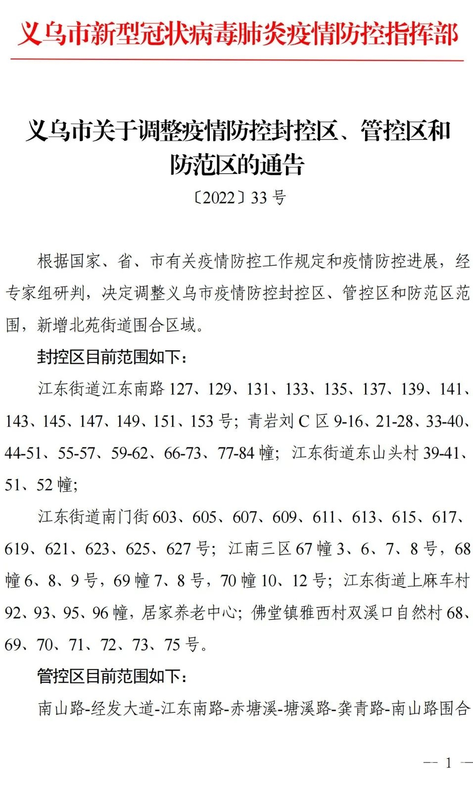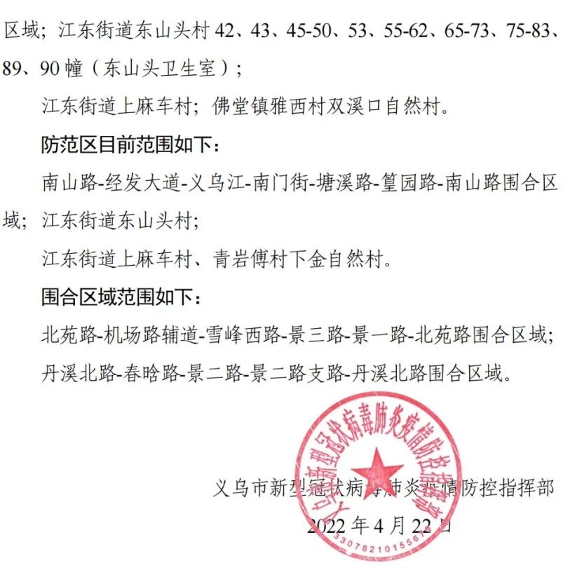 义乌市关于调整疫情防控封控区、管控区和防范区的通告