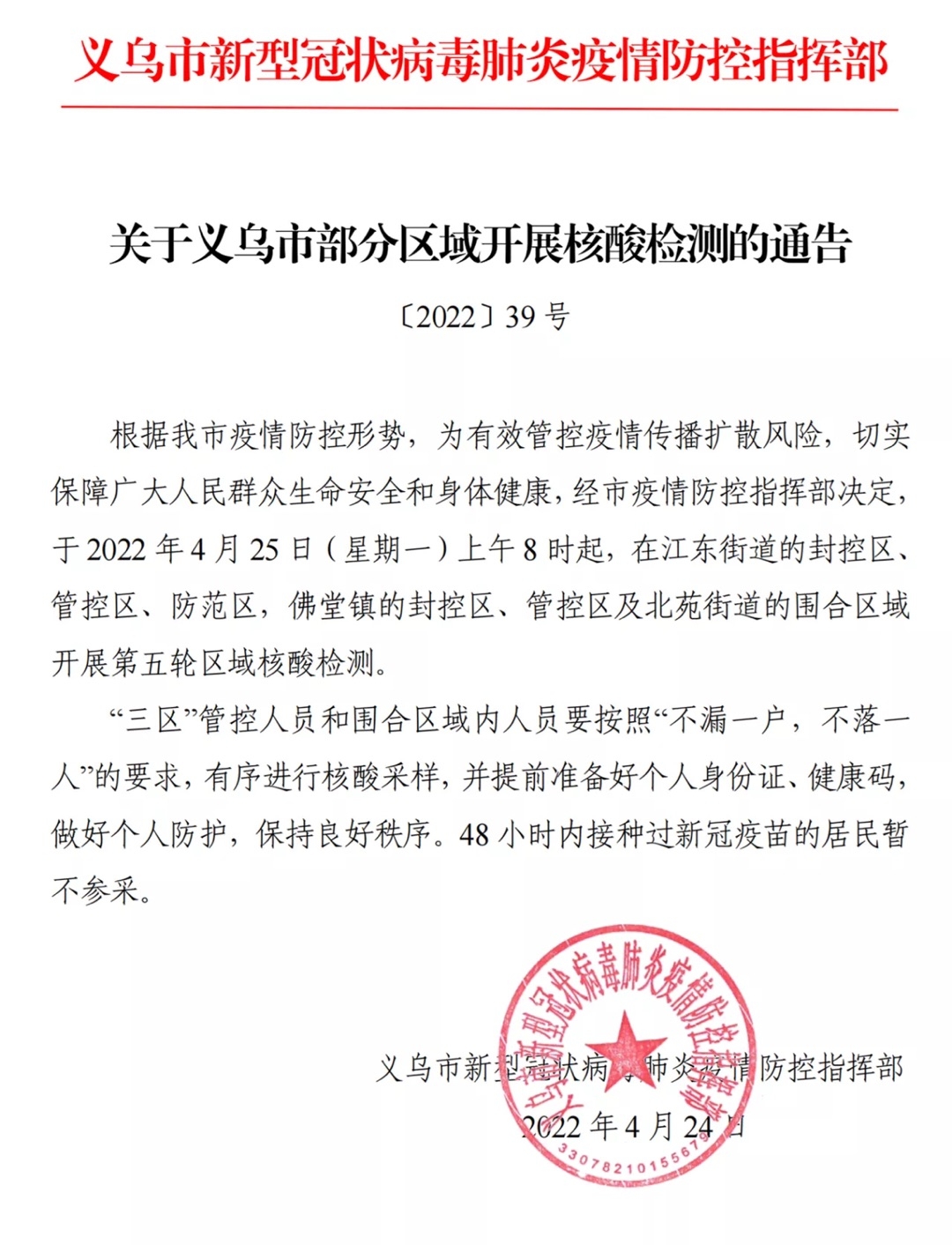 义乌这些地方,明天开展第五轮核酸检测!