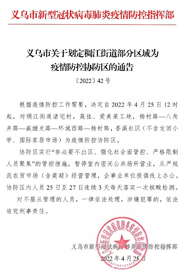 义乌市关于划定稠江街道部分区域为疫情防控协防区的通告