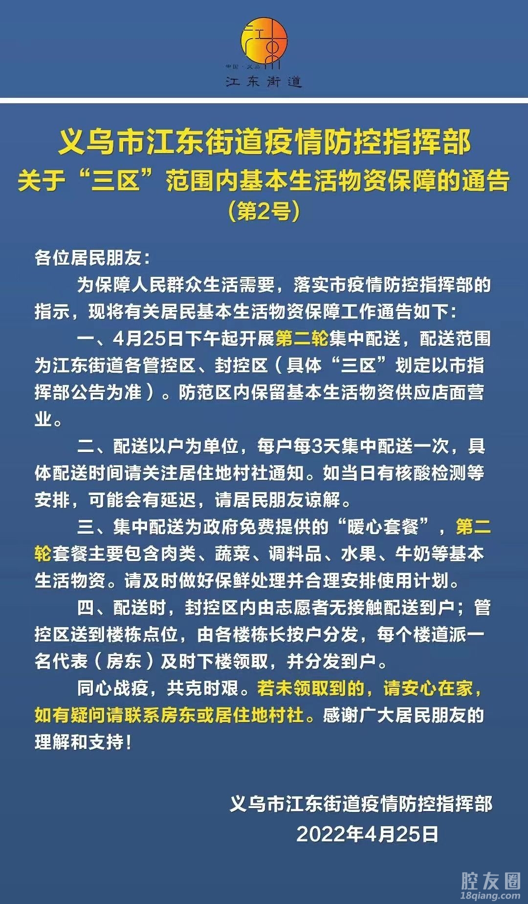 义乌市江东街道关于“三区”范围内基本生活物资保障的通告