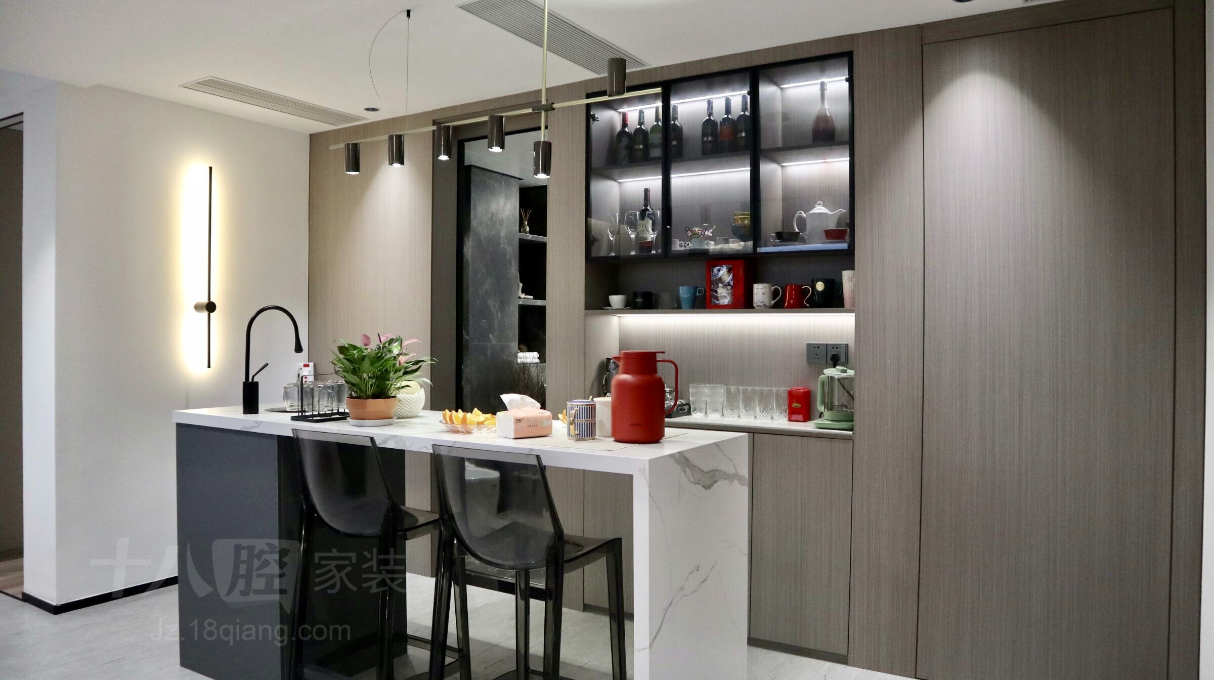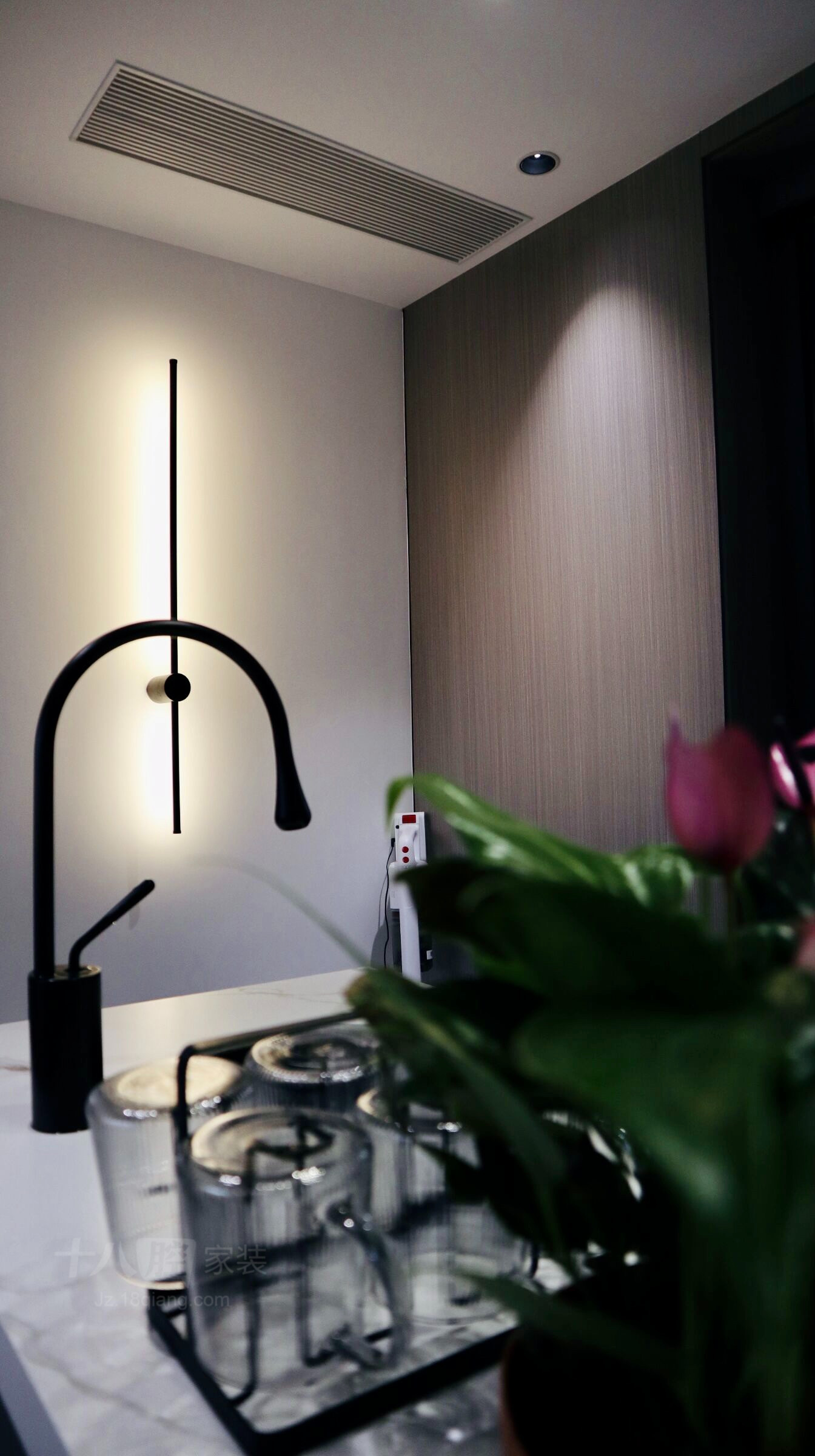 餐厅旁边做了吧台和吧台柜,吧台用了整面的岩板,手感特别不错,吧台柜结合了厨房的隐形门设计,再配上黑色的半透明玻璃柜门,加入了灯带,放上自己喜欢的杯子们,氛围感、幸福感扑面而来。