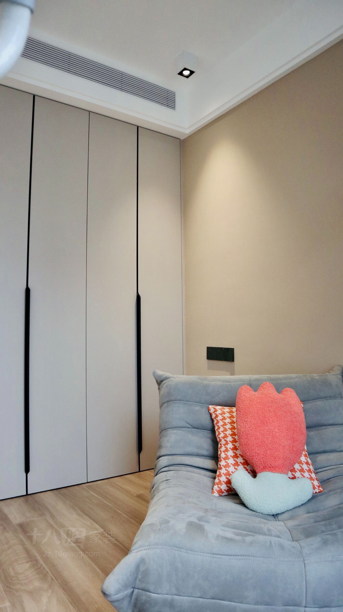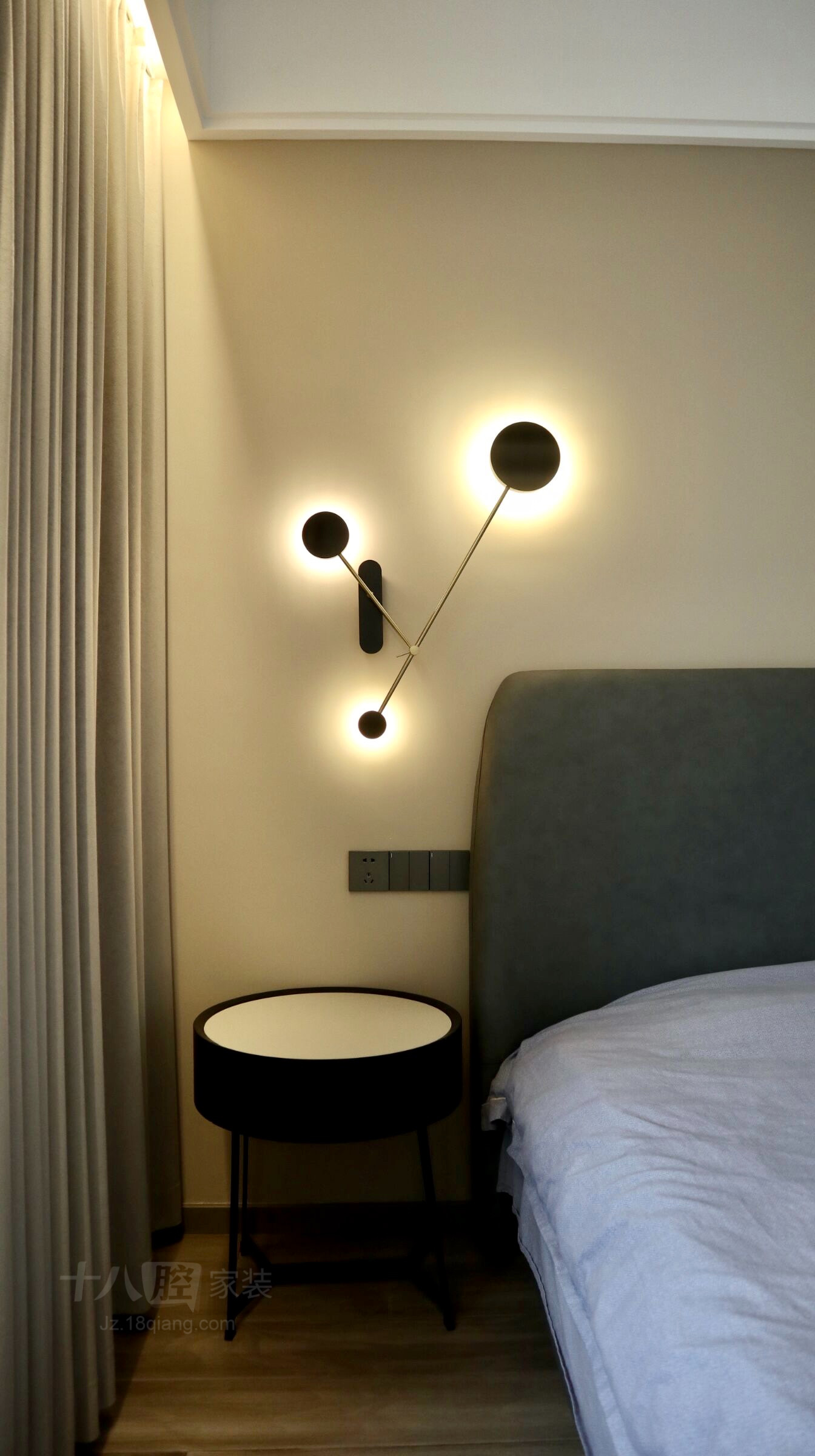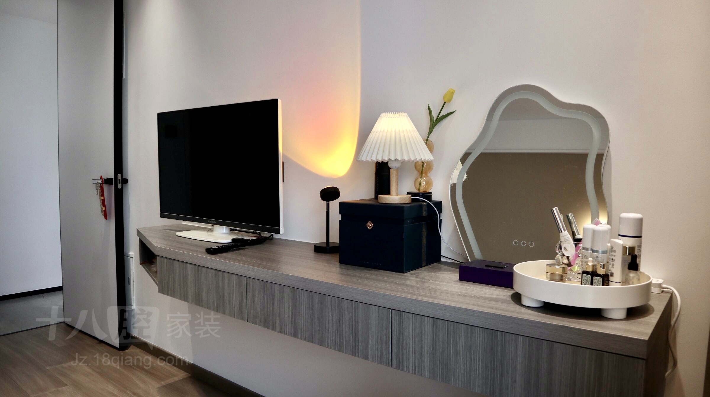 主卧选择了乳胶漆,搭配床头灯,非常的温馨舒适。这种颜色确实很适合房间哦,梳妆台是做了墙排柜,满足了女主人坐在这里日常护肤化妆的生活需要,又方便打扫清洁,扫地机器人说很ok,哈哈哈!