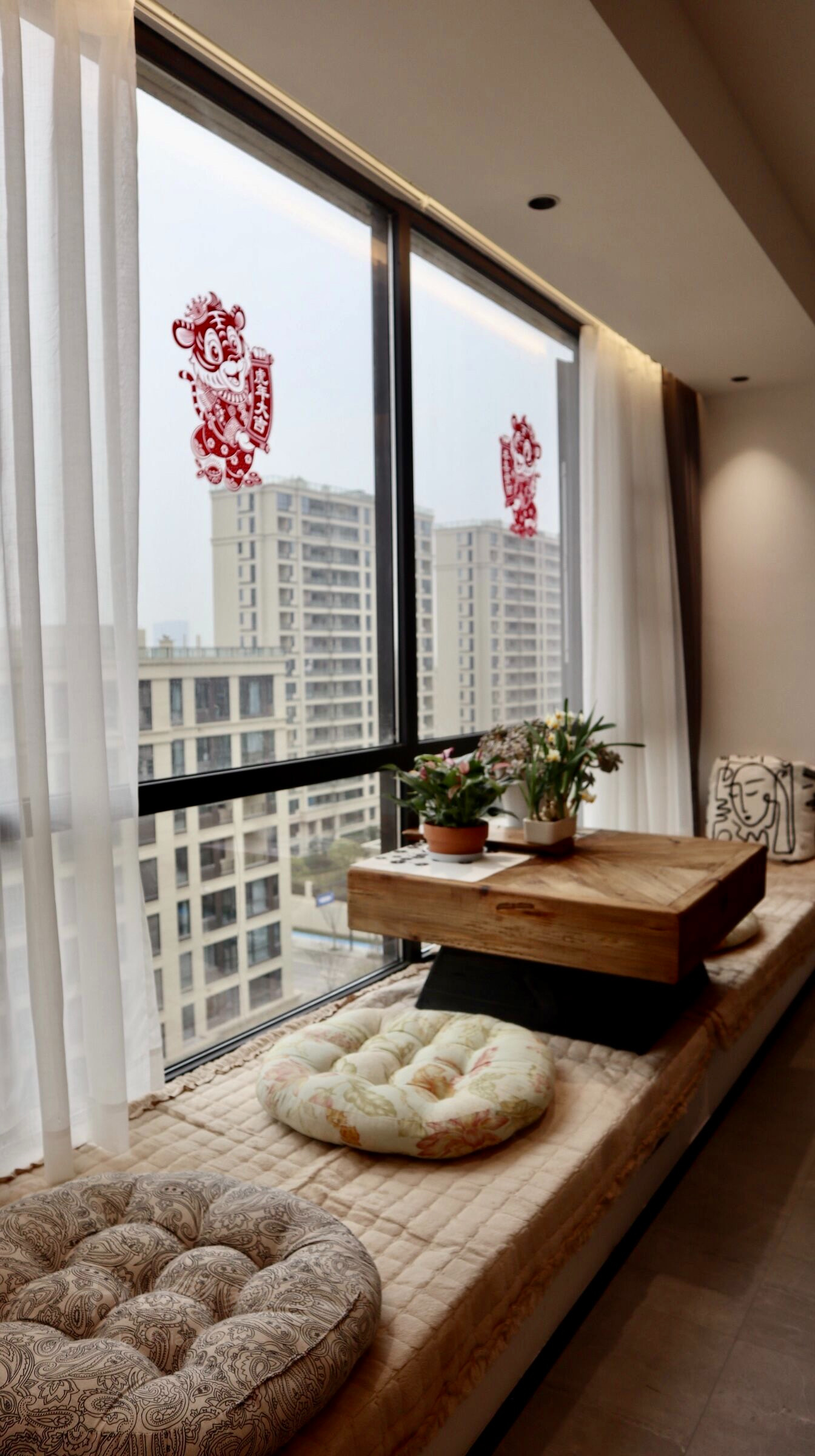 4米多的超长飘窗,2块大岩板进行拼接,工程量也不小哦。放上茶台休闲放松也太惬意了吧。