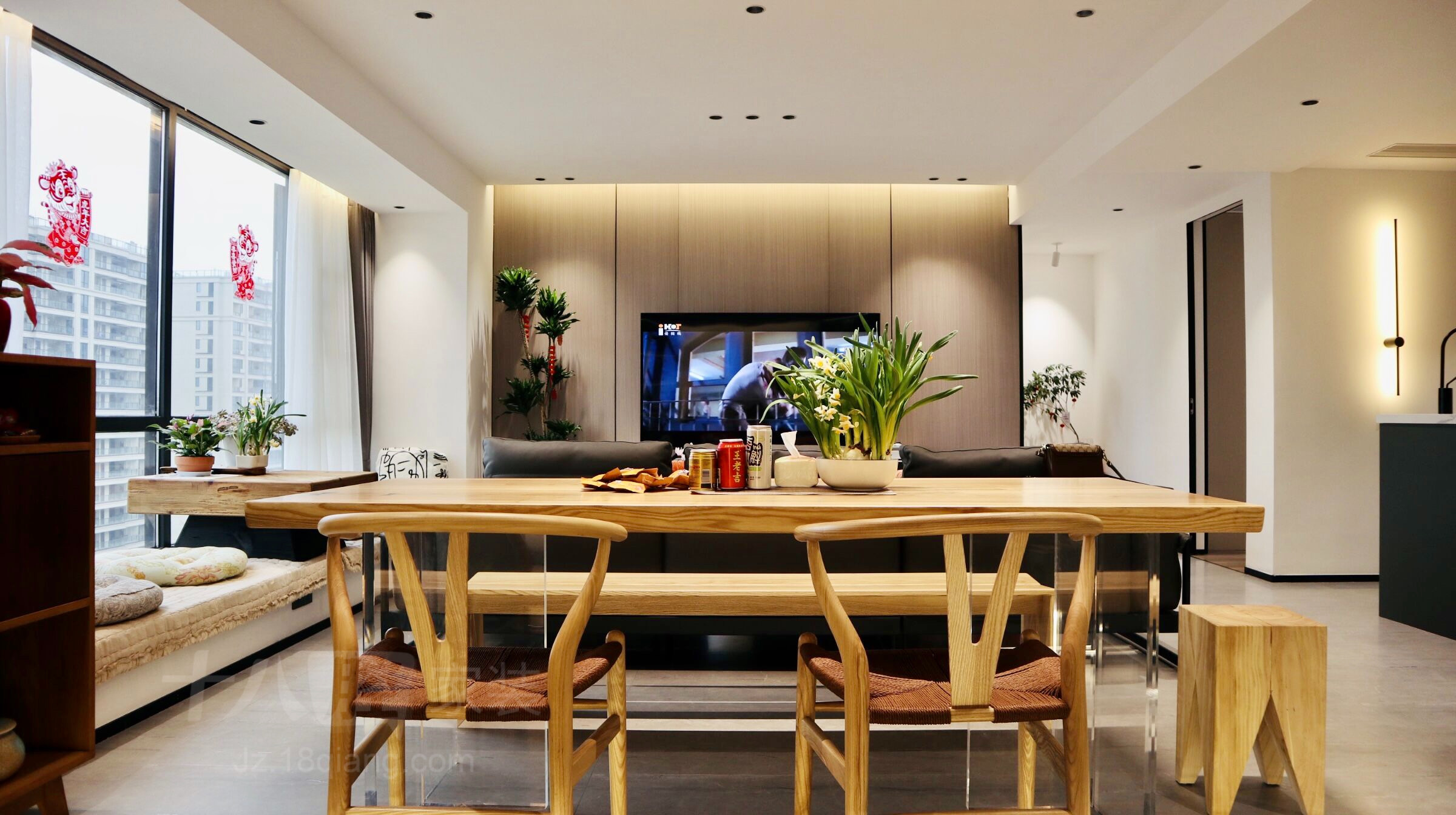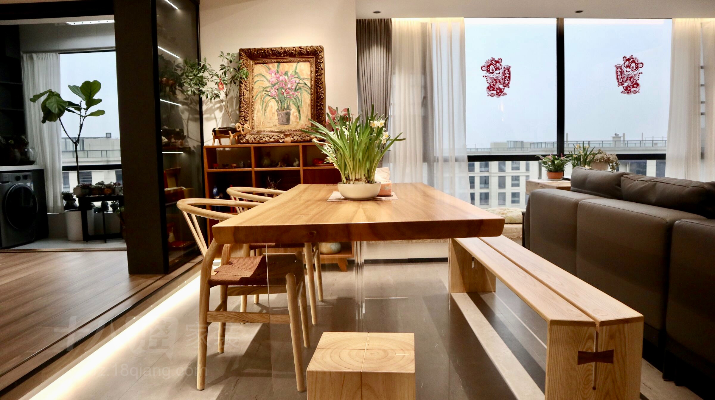餐厅区域的白蜡木悬浮餐桌就是最近一个高级简约的网红产品,白蜡木拼接桌面搭配亚克力桌腿,远处看是不是有一种悬浮的效果,别看他简简单单的,整体造价可是在8000+左右噢!
