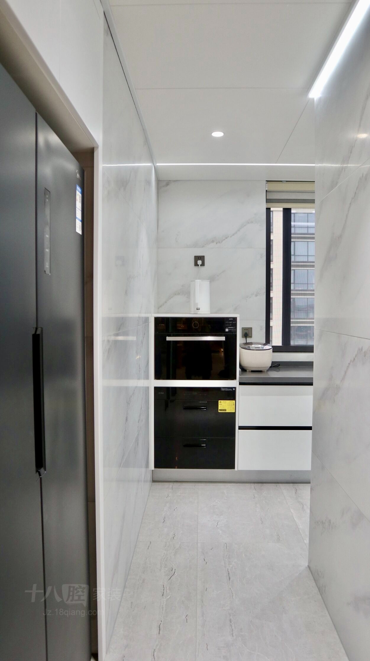 厨房整体白色系,黑白两色简洁大方,虽然入住有一段时间了,但是整体还是非常干净整洁。油烟机做了包柜,更显美观。美赫大板吊顶,非常适合现代简约风格。