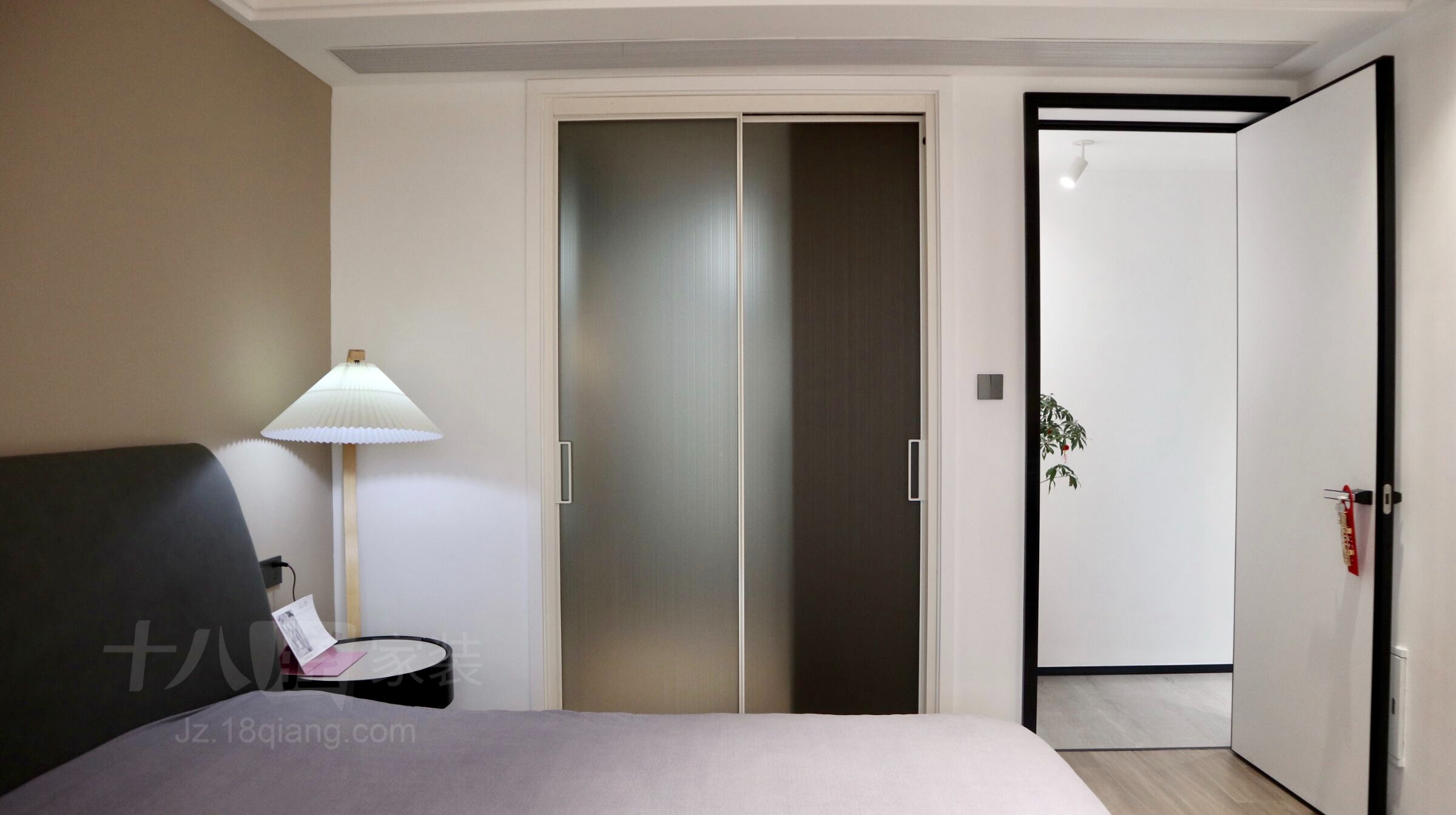 走入式衣柜用茶色玻璃进行隔断,隐藏起来,干净又整洁。两排衣柜足够满足一家人的收纳需求。