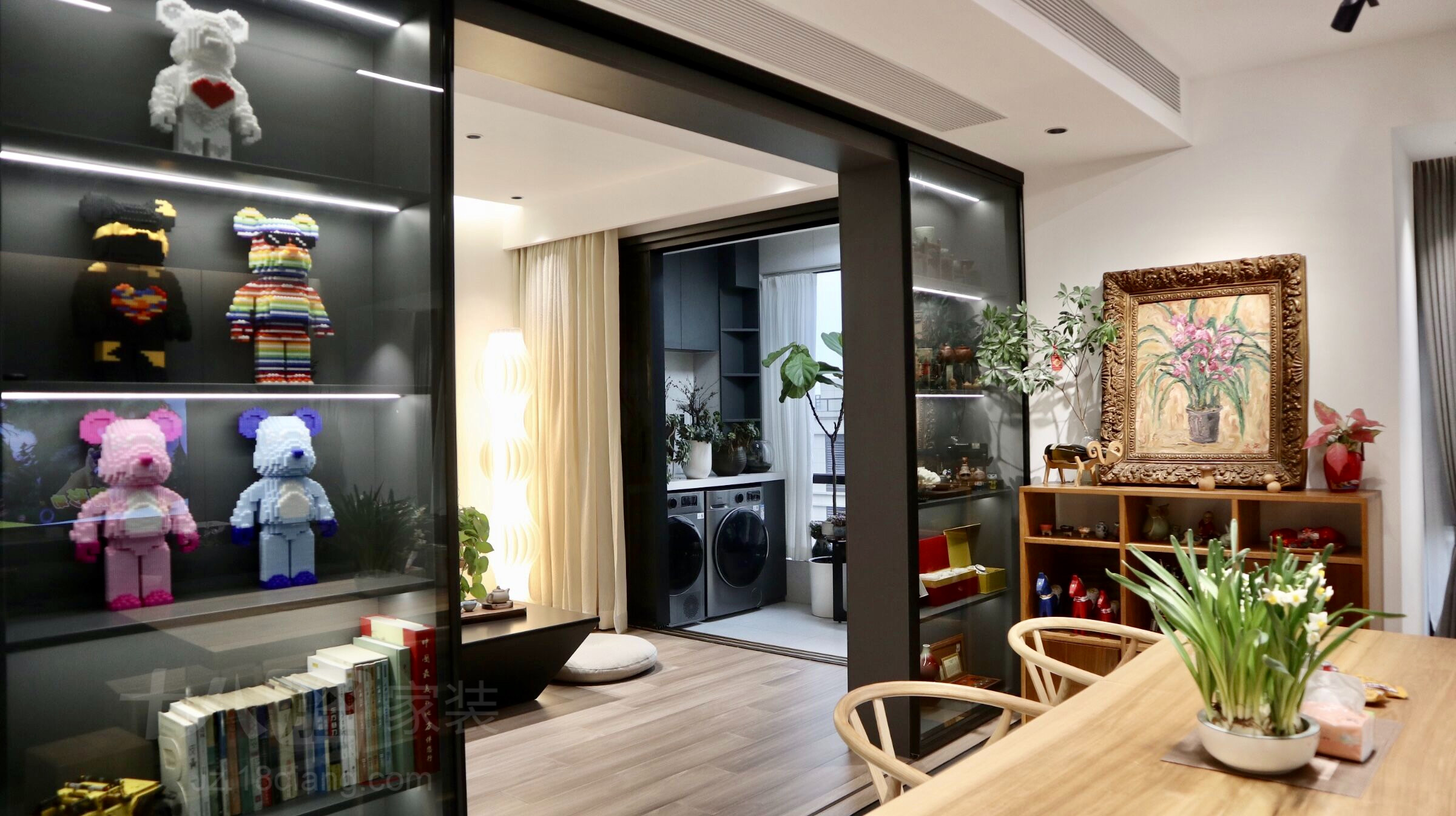 重点来了!原本这里是次卧,但是业主做了调整,不锈钢推拉门+展示柜的组合,让茶室和客餐厅连接起来,所以我们一进门就惊叹,127平,看起来真的太宽敞了!!推拉门拉上,茶室又相对独立,自我休闲放松,或者招待客人都是非常不错的,非常有设计感的茶台和落地灯,氛围感很足。