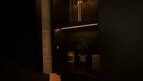 此次设计就用到了灯带和射灯的结合。顶上采用了射灯,灯光是向下打的,如果没有一个向上的光源天花板就会比较黑所以在背景板中加上了灯带并且是向上散发光源的。