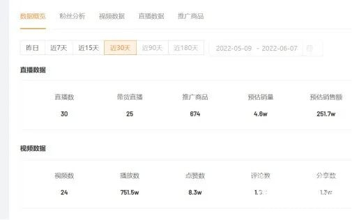 主播安若溪目前在短视频平台有862万粉丝。飞瓜数据显示,近一个月内,安若溪带货直播25次,推广商品674件,预估销量4.6万件,预估销售额251.7万元。据此计算,安若溪近一个月单场带货平均销售额约为10万元。