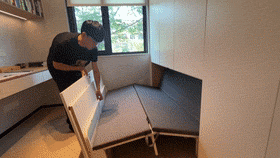 在右侧储物柜下方位置还有个“机关”,按下就能解锁隐形床,轻松解决来家访客不够居住的困扰。空间有限的业主在装修时如果有这样的需求也可以参考哦!