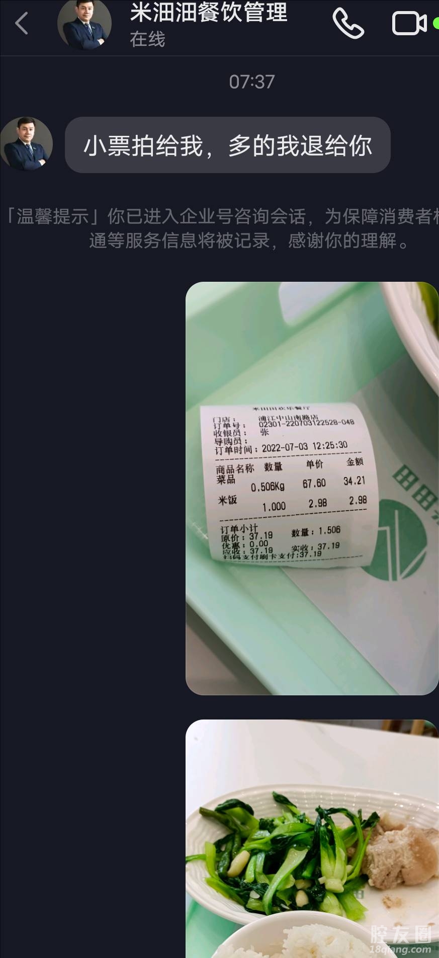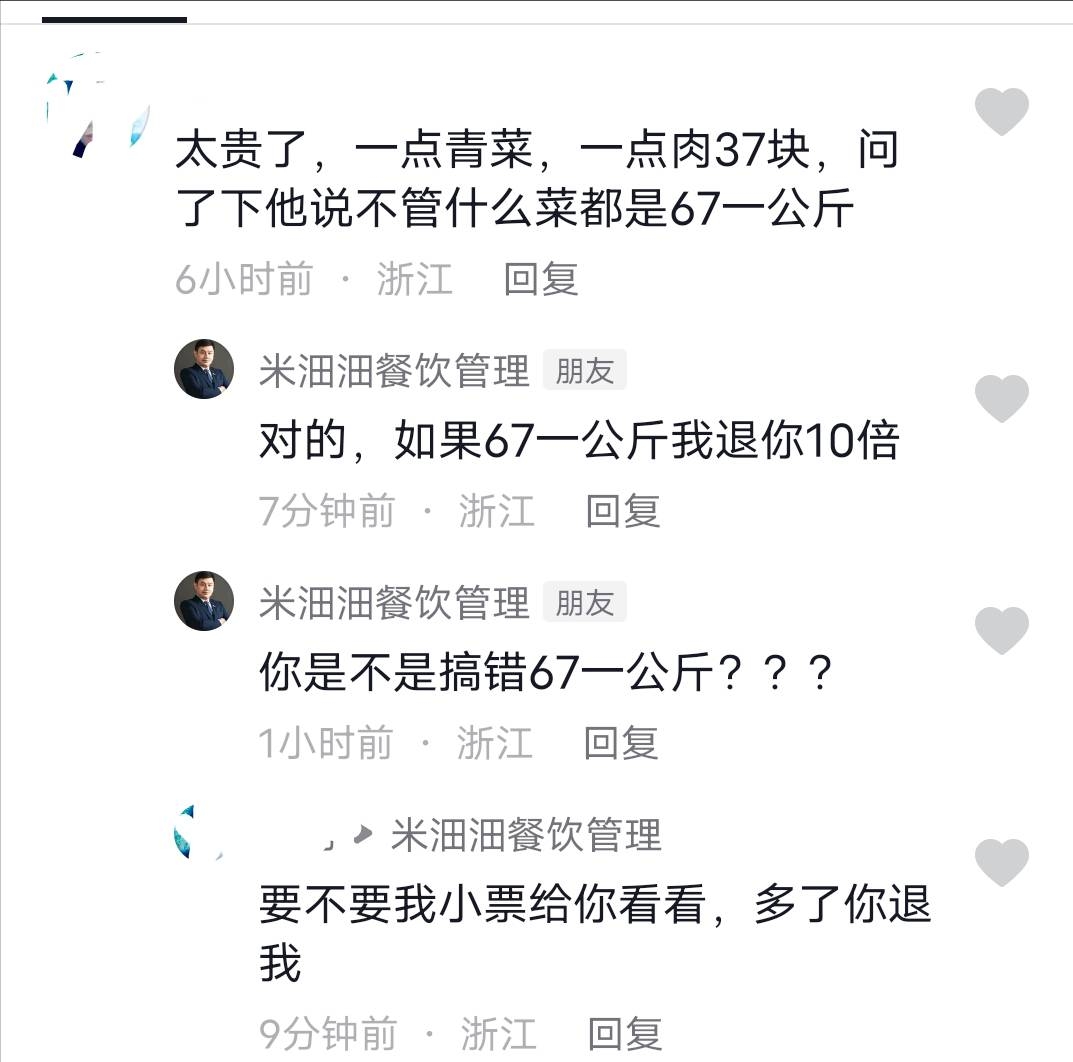 米田田餐厅不讲诚信。我在米田田餐厅吃了一点青菜两块肉。收我37,我说怎么这么贵,他说按67一公斤卖的。过了两天抖音刷到米田田的一个管理人员,他说不可能收67一公斤的,只要你小票写着67一公斤,就退你十倍,结果我小票拿出来他就耍赖了,不退我了,大家去米田田快餐吃的时候小心点。大家给我评评理,他是不是得按照他自己的话退我十倍。