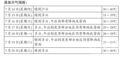 7月11日—13日,我市发布高温红色预警信息,提醒广大市民做好防暑降温工作。据最新天气预报,直至7月20日,最高气温都将在37℃“酷暑线”以上。