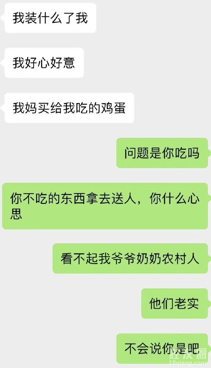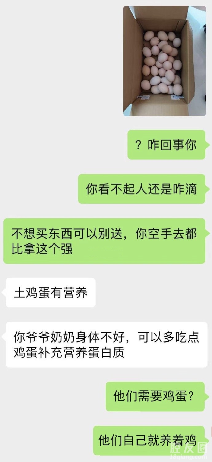 我就觉得她有点瞧不起人,来看我爷爷奶奶至少去买点像样的东西吧,她什么都不买,水果啥的都没有,就把她不吃的鸡蛋拿着来。