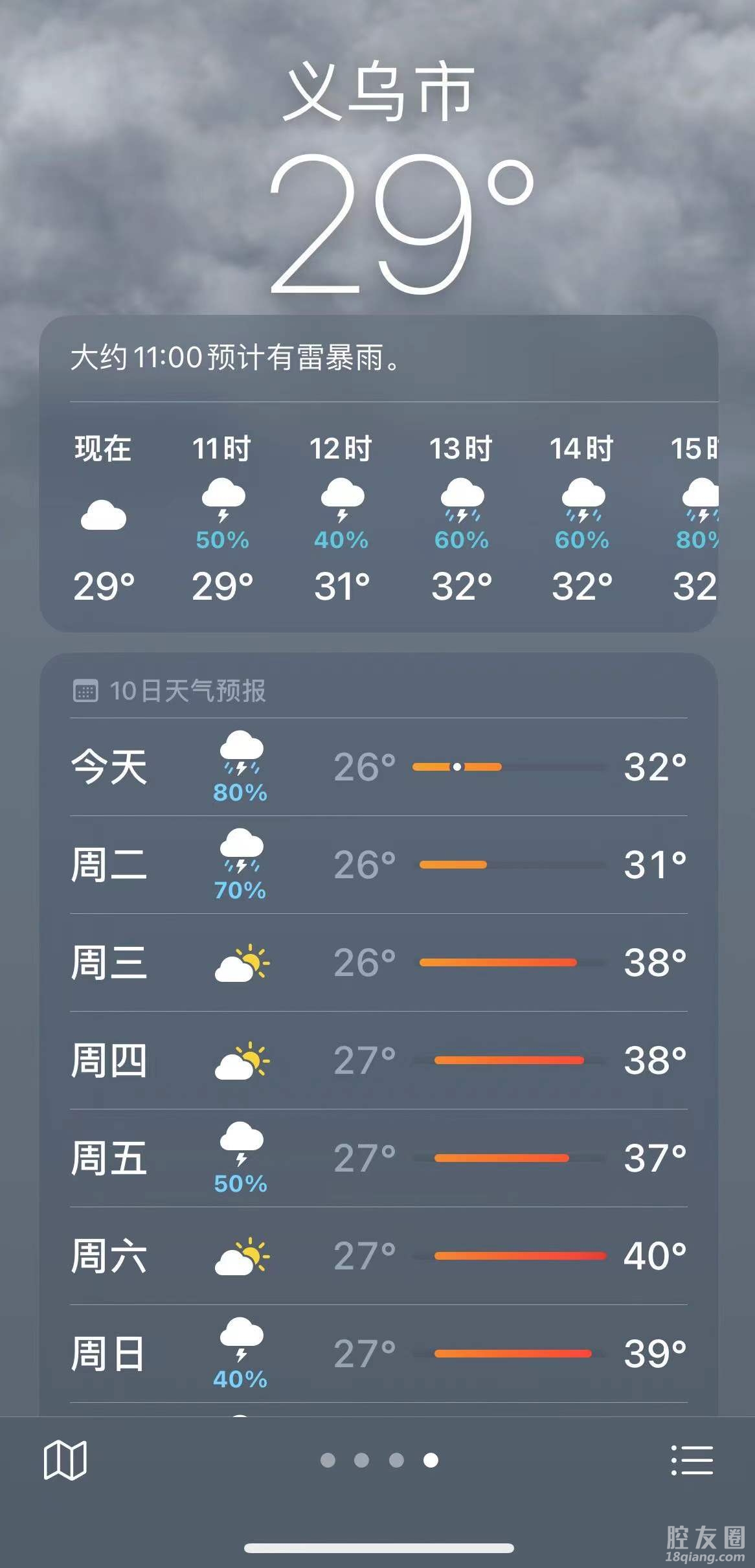 本周开始降雨,总算是告别了40度的高温天气,尤其是今日周一至周二两天温度降到30度,今日中午11点左右会有雷暴雨,出行小伙伴带好伞喔!