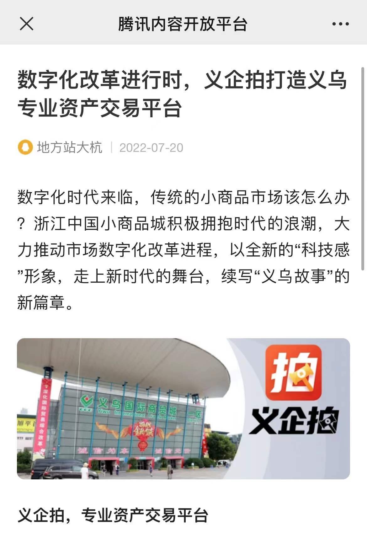 这一口号登上凤凰网财经、浙江每日经济网、网易新闻、腾讯新闻等各大媒体首页,由义采宝联合商城集团、一通拍卖、招商银行倾力打造“义企拍”,为有买、卖、租商位需求的人们,提供公开、公平、公正、完善且高效的在线交易平台,誓要打造义乌专业资产交易平台!