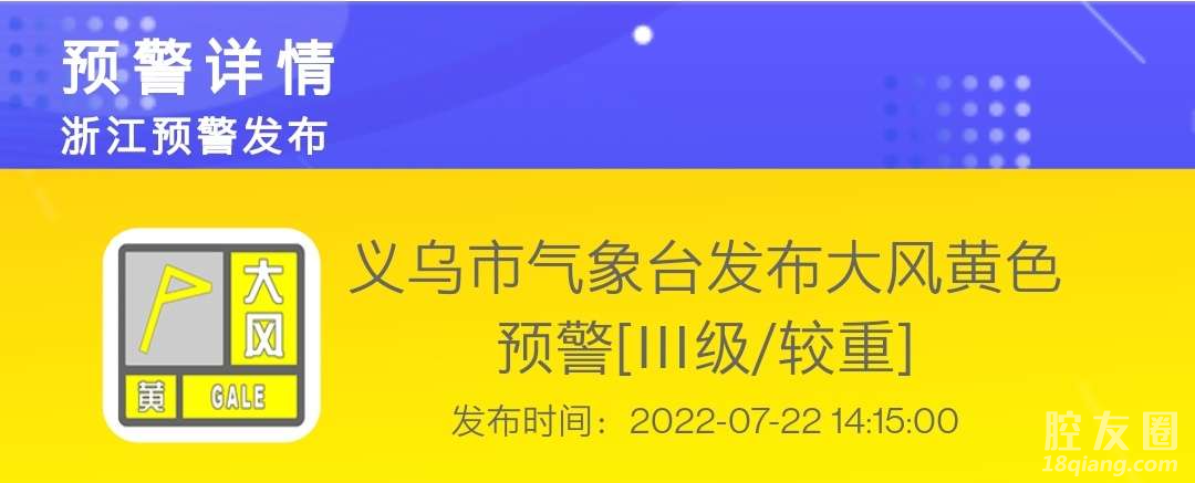 今天14时15分 义乌市气象台发布 大风黄色预警信号 受强对流云团影响 预计今天下午 大陈、苏溪、廿三里 后宅、稠城、福田等镇街 阴有阵雨或雷雨 有雷雨地区可伴有6-8级阵风 并可伴有短时强降水、强雷电 等强天气