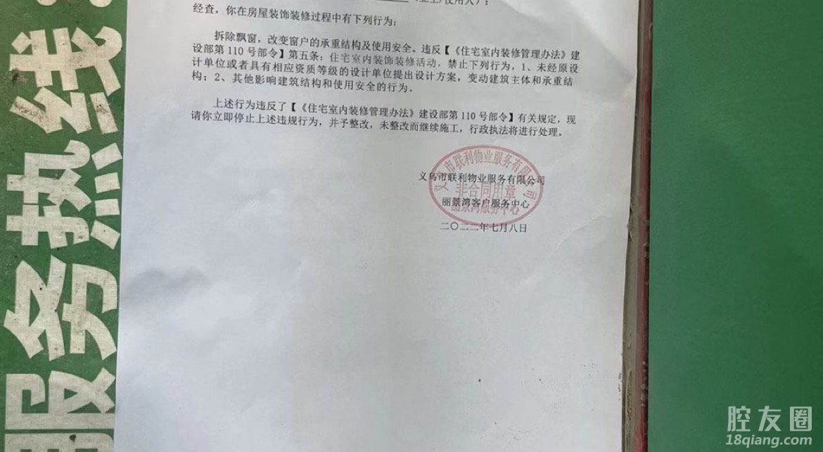 感谢平台,拖了半个月的丽景湾装修事件,终于有了进展。2022年7月8日责令整改到2022年7月23号一直没有明确的整改方案。只因为发布了十八腔结果没两天有关部门就出台了明确的整改方案。感谢平台为老百姓发生,感谢广大腔友的关注,让我们这些新义乌人有了申诉的平台