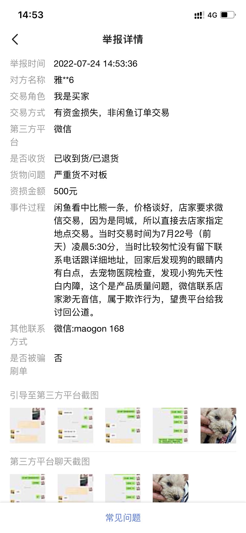 闲鱼看中比熊小狗,店家引导微信交易,结果狗子到手,发现眼睛有先天性白内障,店家结果不接微信,不回复。闲鱼投诉也是没用,以后大家买东西一点要小心
