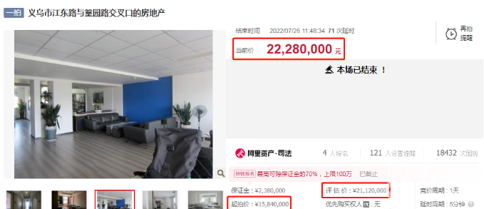 此次竞拍引来4人报名,18432余次围观,121人设置提醒。评估价2112万,起拍价1584万元,保证金238万元,增价幅度7万元。