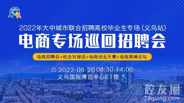 从义乌市人社局获悉,2022年大中城市联合招聘高校毕业生义乌站(电商专场)巡回招聘会暨校企合作对接会,将于8月20日8:30-14:00在义乌国际博览中心E1馆举行