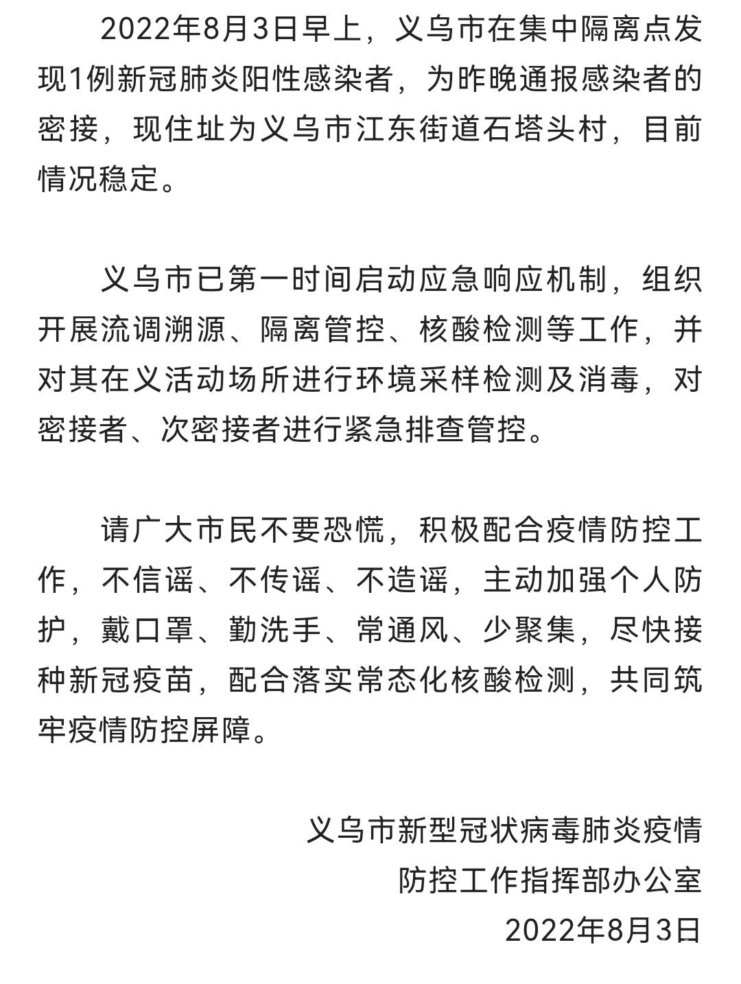 关于义乌市集中隔离点发现1例新冠肺炎阳性感染者的通