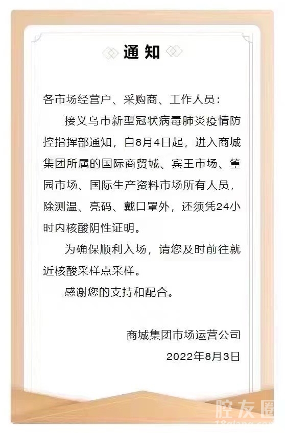 自8月4日起,进出义乌市场需要24小时内核酸阴性证明