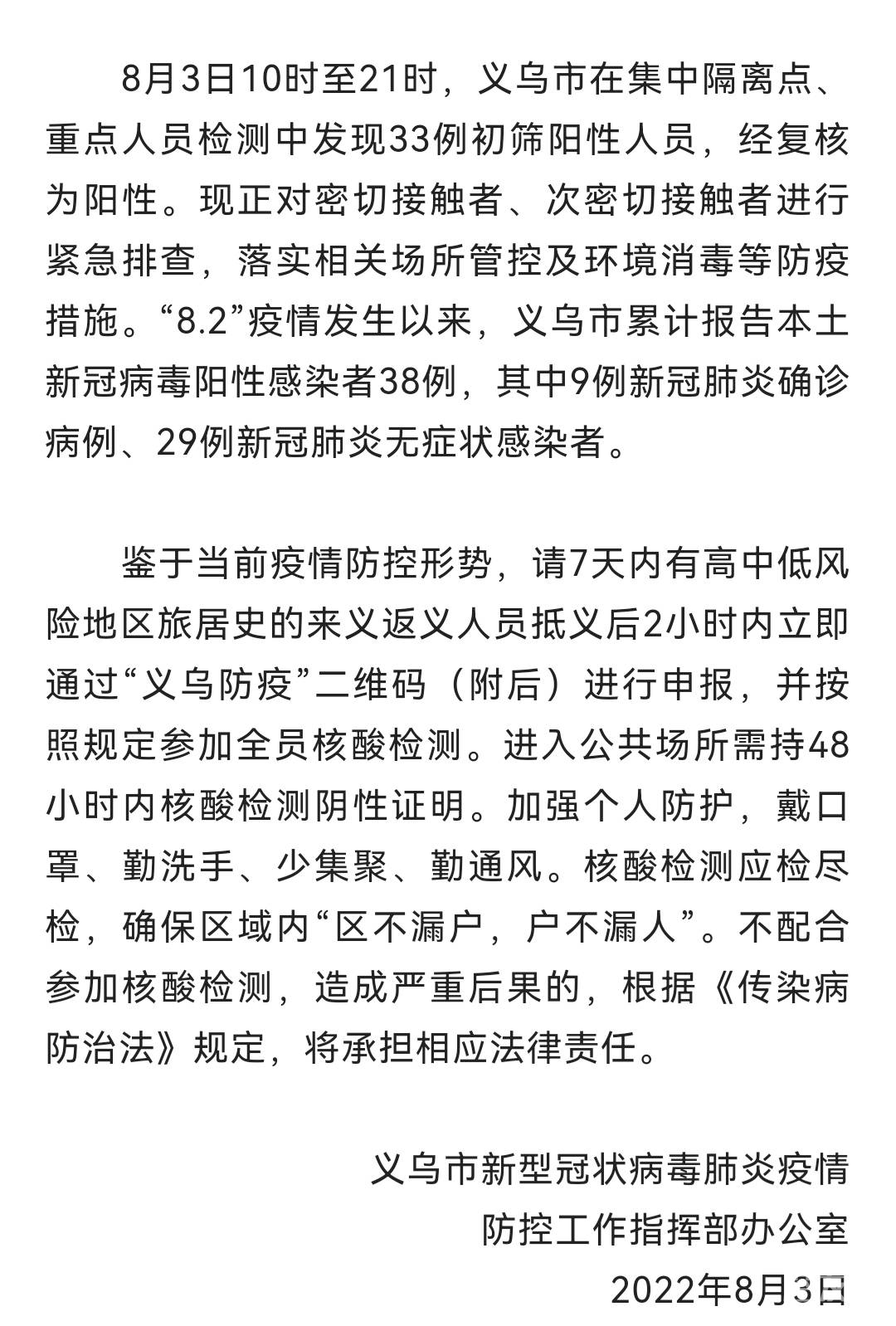 关于义乌市新增33例新冠病毒阳性感染者的通报