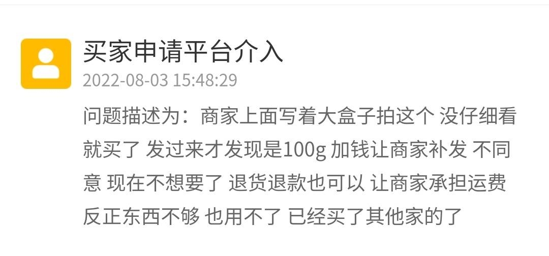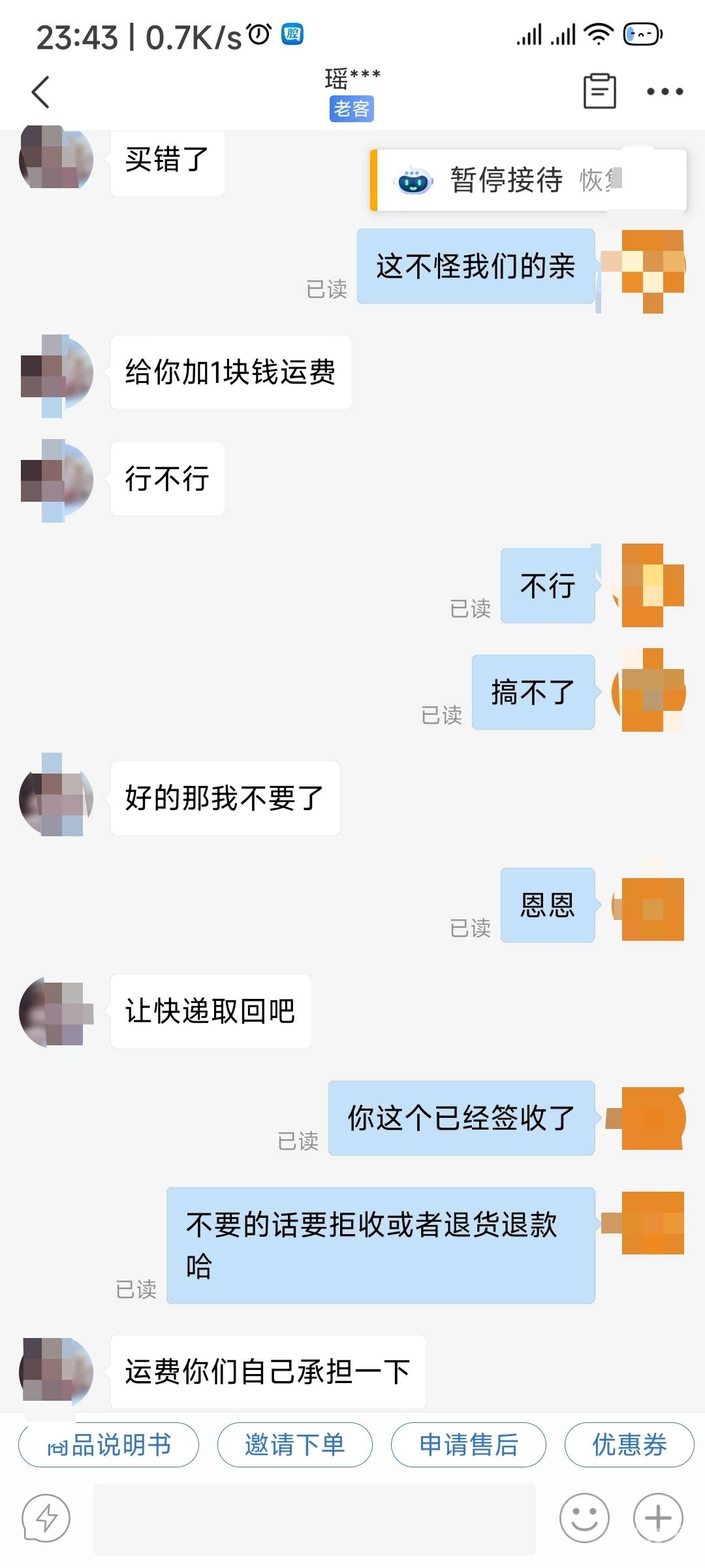 自己买错了,加一块钱让我给他再发一个,你踏马想什么呢?自己买错了,还要我出退货运费,平台也是狗比东西,申请的仅退款还给她退了。什么玩意东西,丢人现眼,等我有空去你家问下你爸妈怎么教你做人的